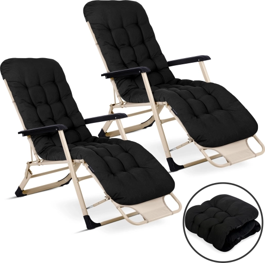 Ligstoelen van Texline-stof zijn bestand tegen UV en weersinvloeden en nemen na het opvouwen minimale ruimte in – ideaal voor tuin, terras en onderweg.