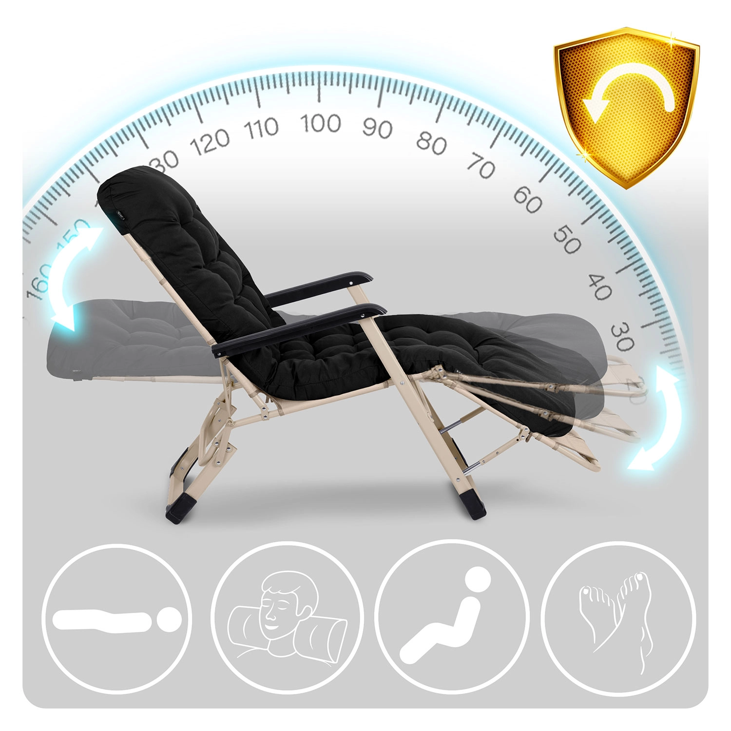 De Texline-stof droogt snel, is gemakkelijk te reinigen en is bestand tegen UV-straling en temperatuurschommelingen. Ergonomische armleuningen van slijtvast kunststof, een afneembaar hoofdkussen en antislip doppen op de poten verhogen het comfort en de veiligheid bij dagelijks gebruik.