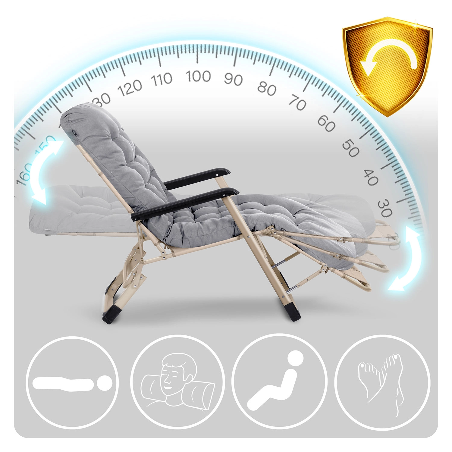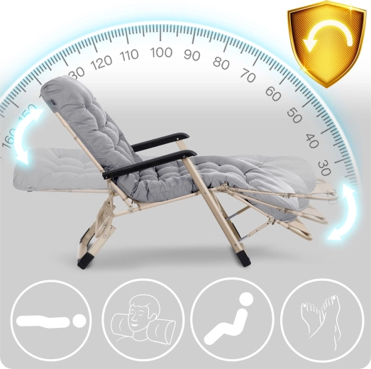 Stel de rugleuning traploos in en gebruik 3 standen voor de beensteun. De ligpositie ontlast de wervelkolom en verbetert de doorbloeding dankzij de verhoogde benen.