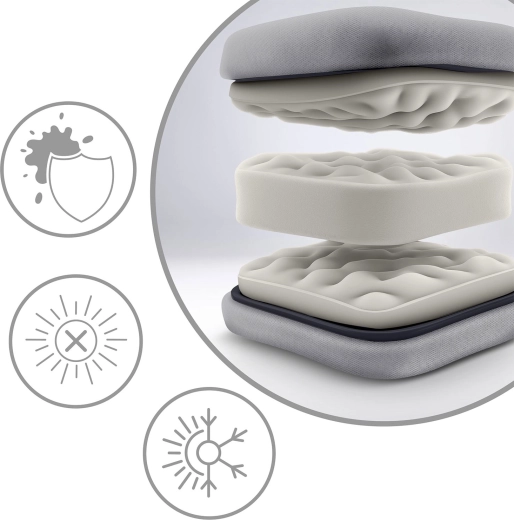 Het zachte, veerkrachtige en doorgestikte kussen met afneembare hoofdsteun ondersteunt hoofd, nek en rug en zorgt voor langdurig comfort zonder drukpunten.