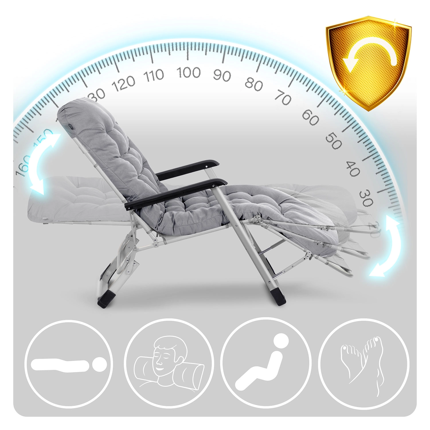 • Variabele ontspanning: vloeiend verstelbare rugleuning en 3 standen voor de voetensteun, mogelijkheid tot volledig liggen.