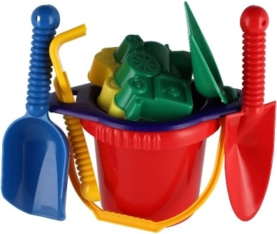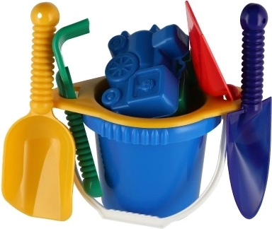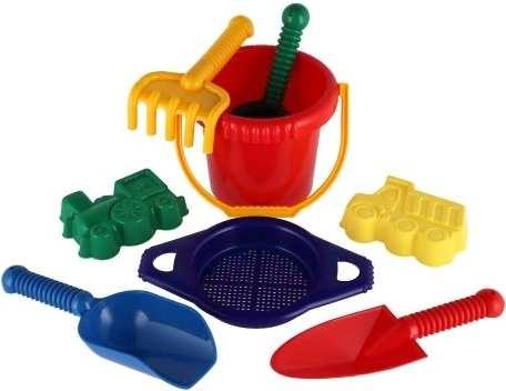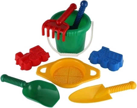Bevat alle benodigde gereedschappen voor bouwen en creatief spel in het zand - een emmer, zeef, schepjes, harkjes en twee zandvormpjes.