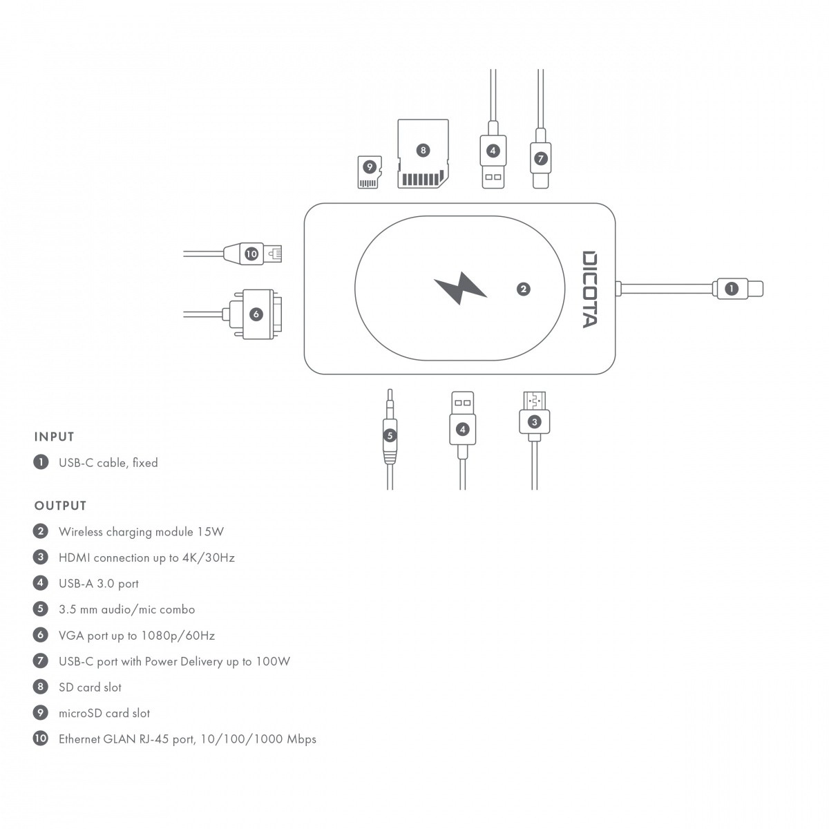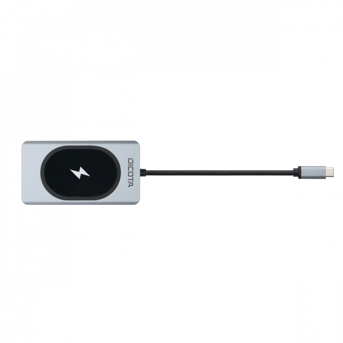 De elegante aluminium DICOTA USB‑C hub breidt één enkele poort van je laptop uit tot een volwaardig dockingstation. Sluit een extern display in 4K-resolutie aan via HDMI of een projector via VGA 1080p; een stabiele verbinding wordt verzekerd door RJ‑45 tot 1000 Mb/s. Het geïntegreerde pad met bliksemsymbool maakt Qi‑draadloos opladen tot 15 W mogelijk – ideaal voor telefoon of oordopjes.