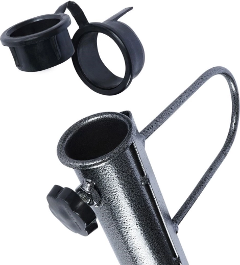 In de verpakking zitten kunststof adapters voor stokdiameters van 25, 32 en 35 mm, zodat u de standaard eenvoudig aan verschillende modellen kunt aanpassen. Dankzij de scherpe punt gaat het plaatsen snel en veilig; de zijhandgreep helpt bij hefbomen en uitlijnen. Compacte afmetingen van 42,5 × 18,5 cm maken vervoeren en opbergen gemakkelijk.