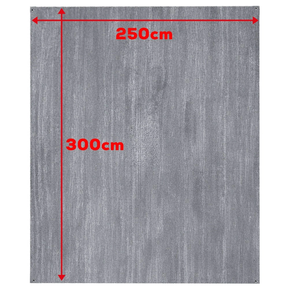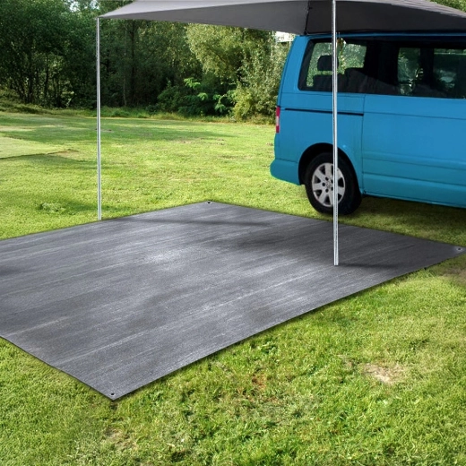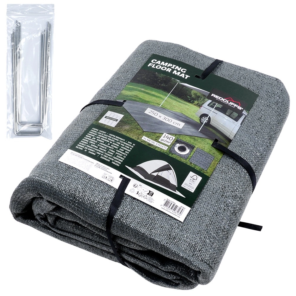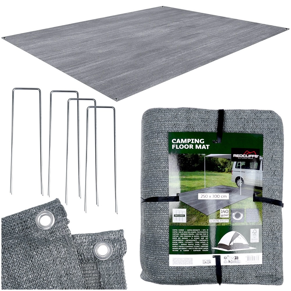 Praktische vloermat voor in de tent en voortent met afmetingen 250 × 300 cm zorgt tijdens het kamperen voor netheid, droogte en extra comfort. Gemaakt van duurzame en gemakkelijk afwasbare gaasstof in grijs, voorzien van metalen ogen voor verankering en inclusief 4 haringen voor stabiele bevestiging. Ook geschikt onder de luifel van de caravan, in een prieel, op het strand of voor een picknick.