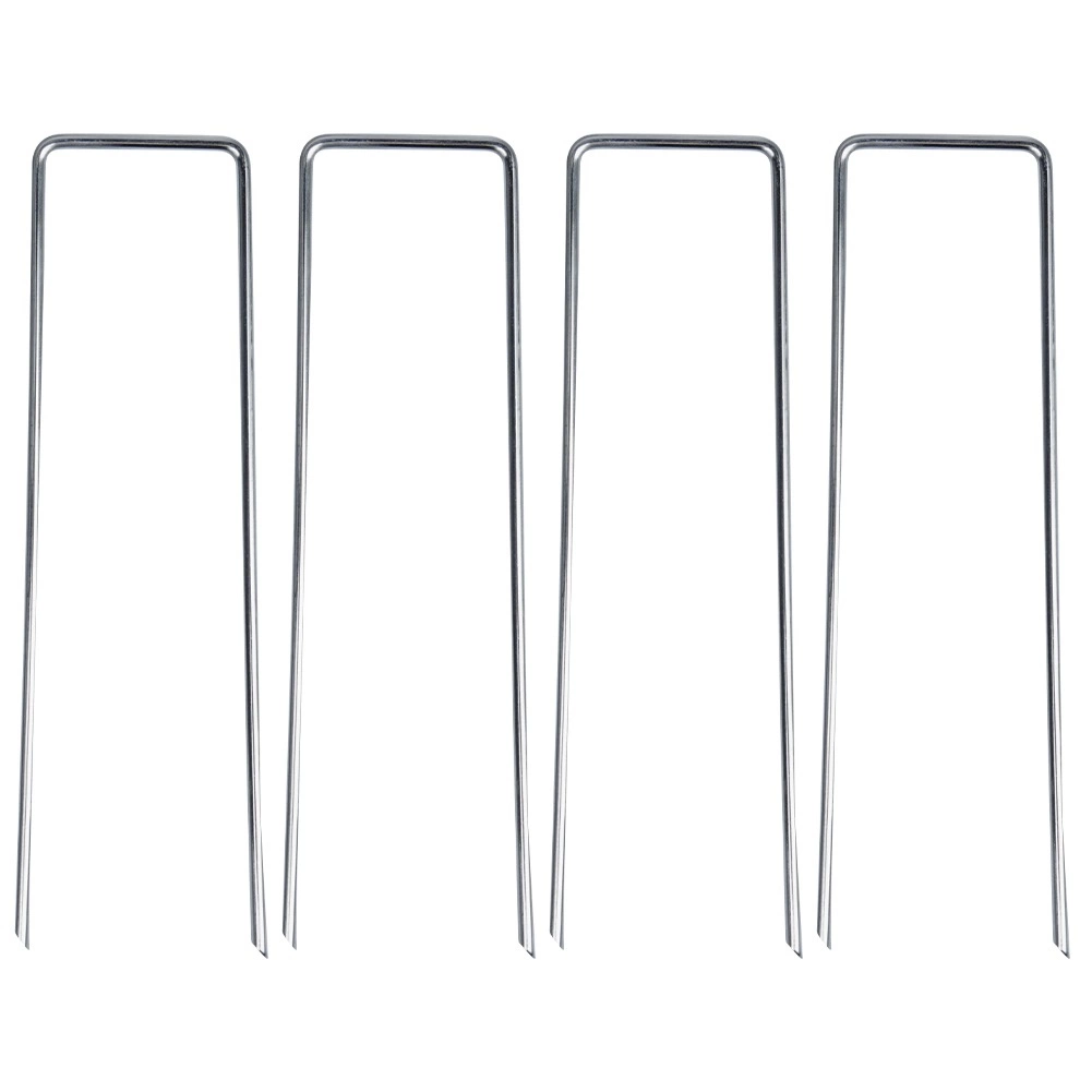 De set bevat 4 U-haringen waarmee je de mat eenvoudig in de grond vastzet, zonder extra accessoires aan te schaffen.