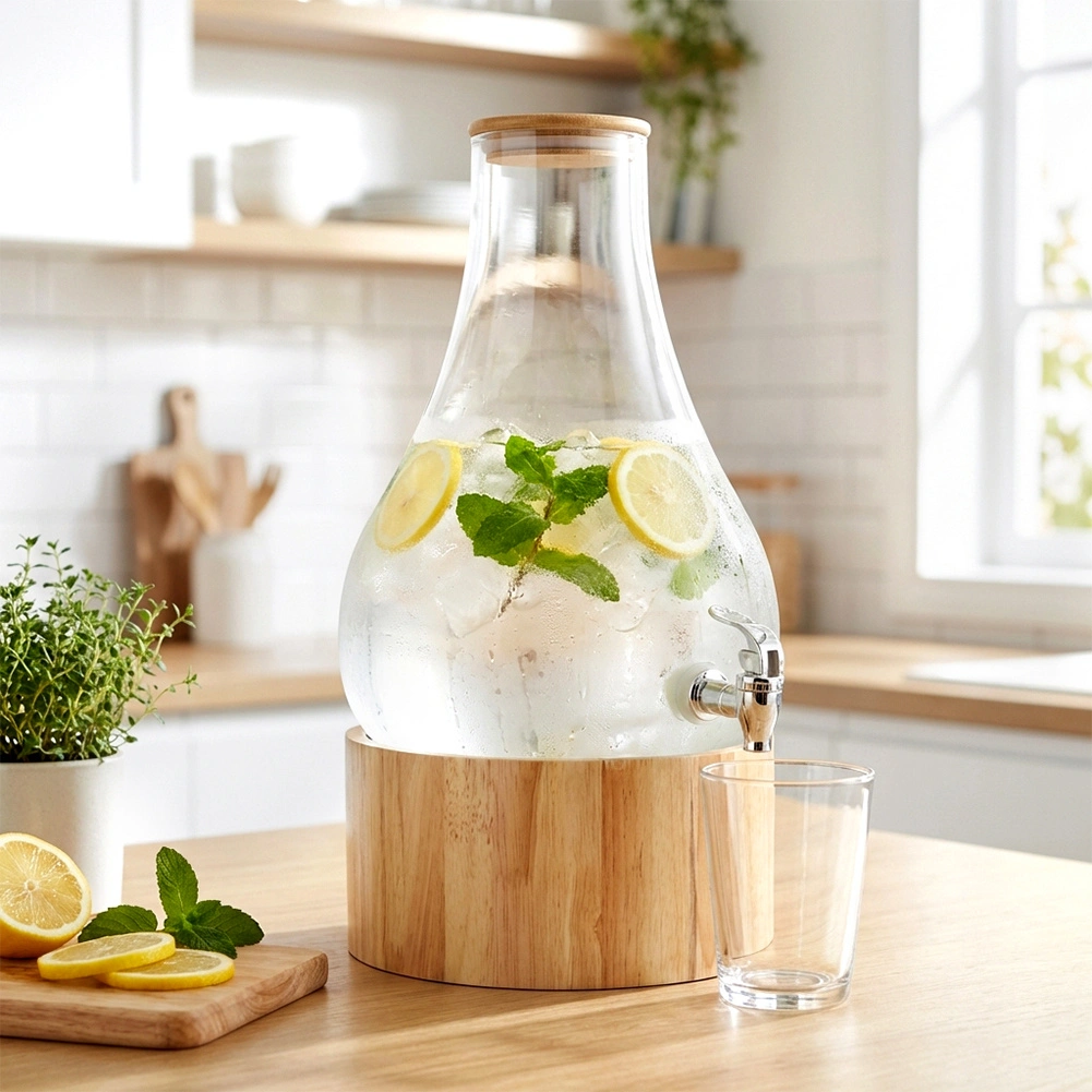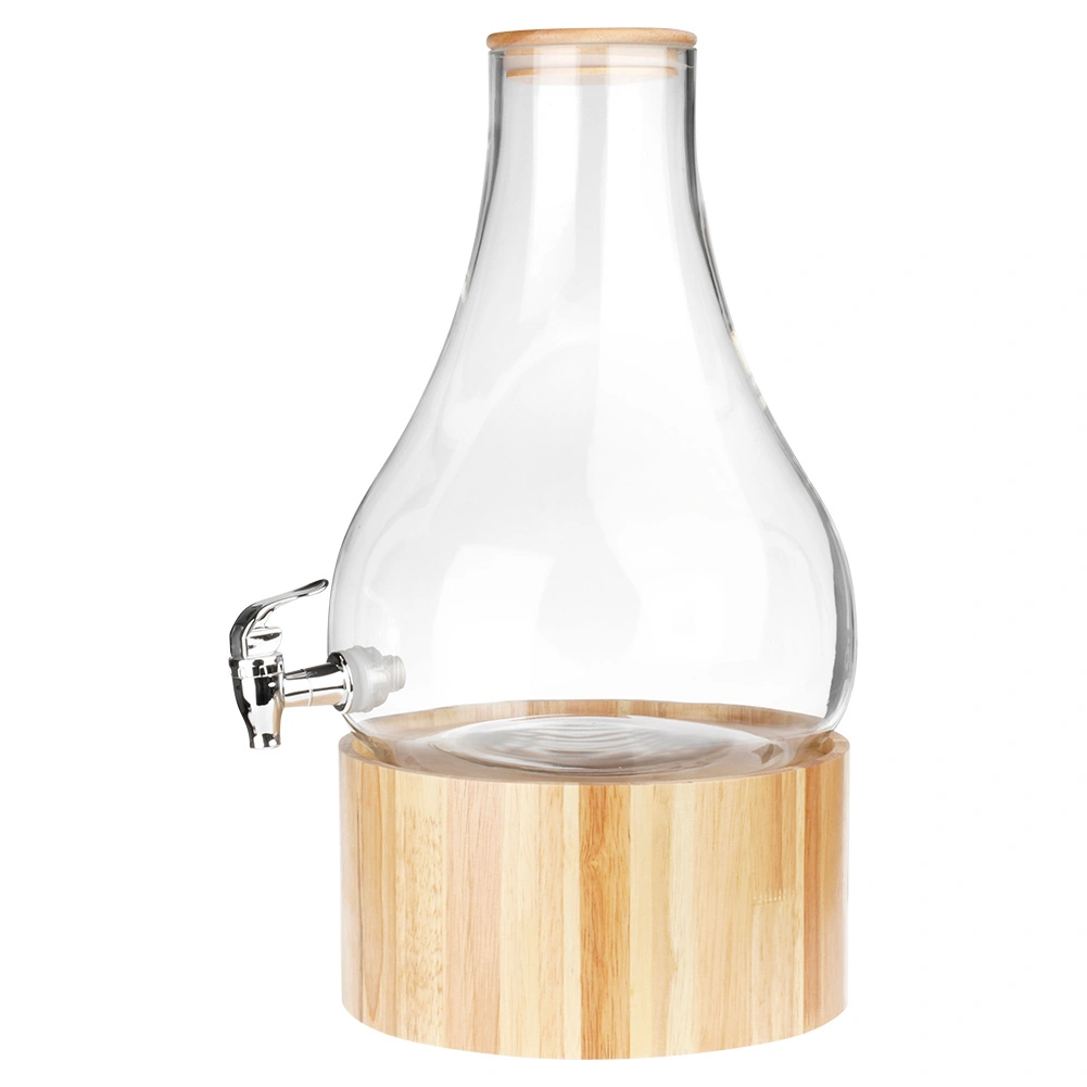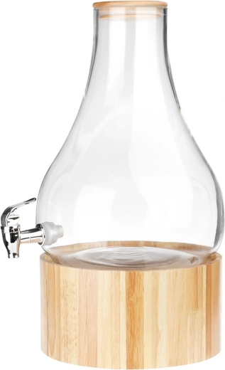 De elegante drankdispenser van hoogwaardig dik glas combineert natuurlijke vormgeving met functionaliteit. Het bamboe deksel met afdichting houdt de inhoud vers en beschermd, terwijl de kraan met metalen look zorgt voor soepel en schoon schenken. Dankzij de stabiele houten standaard bevindt de uitloop zich op ideale hoogte voor glazen.