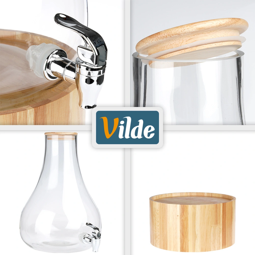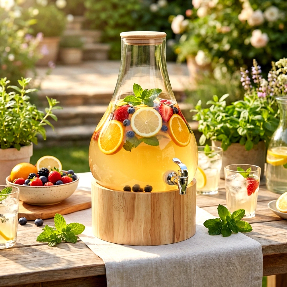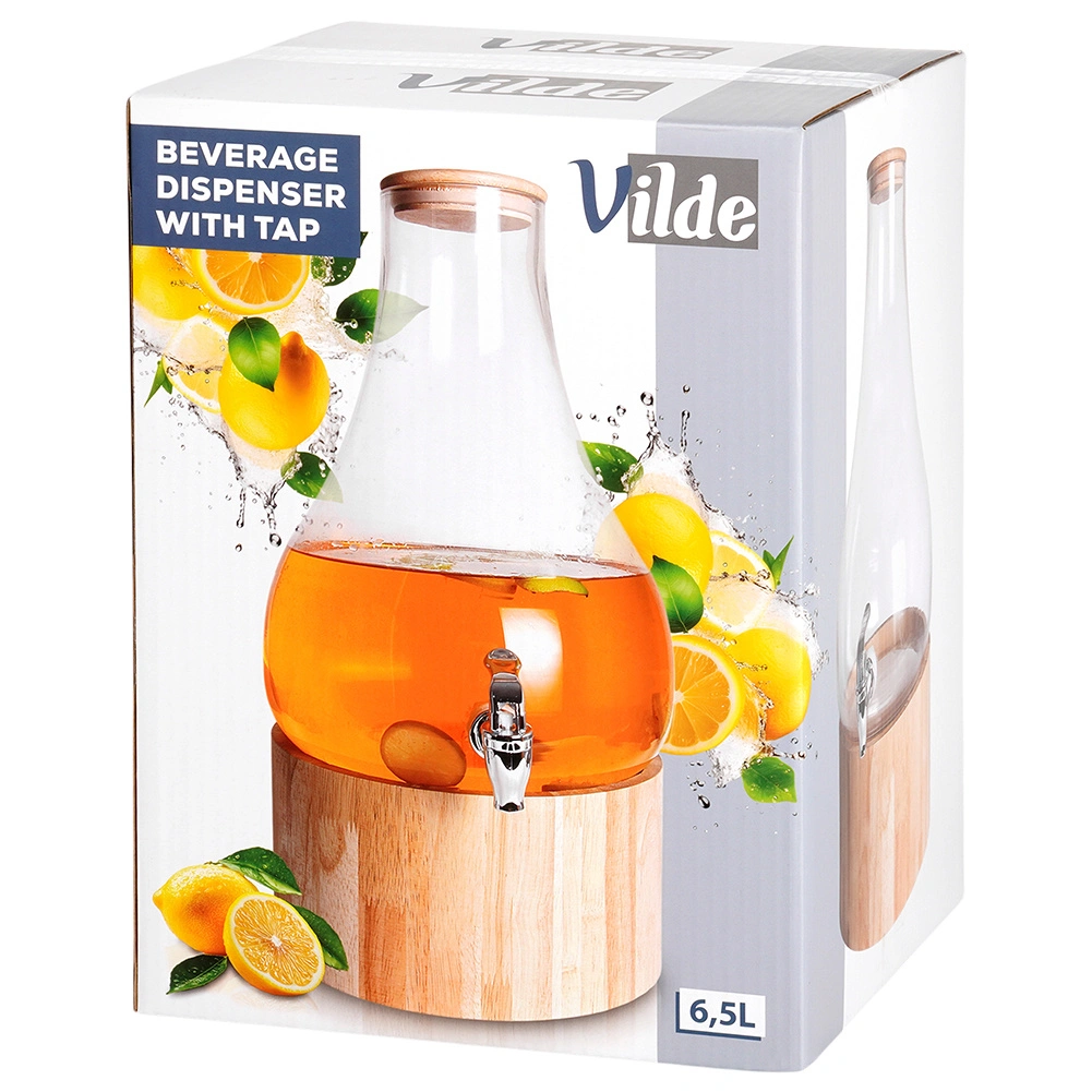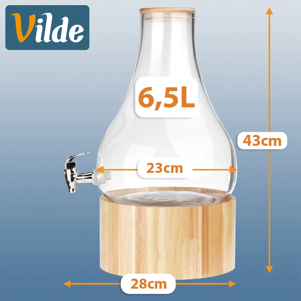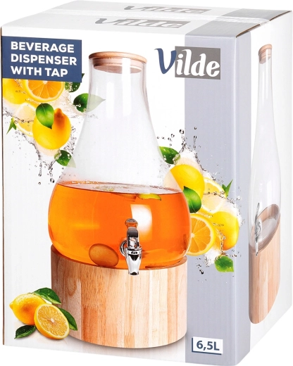 Stijlvolle glazen dispenser met een inhoud van 6,5 l, houten standaard en bamboe deksel – ideaal voor het serveren van limonades, water of punch. Dankzij de praktische kraan en de verhoogde standaard is inschenken maximaal comfortabel, terwijl het afsluitende bamboe deksel dranken beschermt tegen vuil en insecten. Stevig dik glas, eenvoudige bediening en veelzijdig gebruik voor tuinfeesten, thuis en in de horeca.