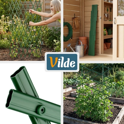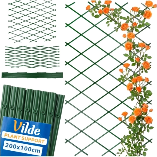 Praktische tuintrellis voor klimplanten met afmetingen 200 × 100 cm, met een uitschuifbare constructie, duurzame kunststof uitvoering en eenvoudige montage. Ideaal voor rozen, klimop, druiven en andere klimplanten in de tuin, op het balkon of terras. In het groen blendt hij natuurlijk in de omgeving en helpt hij planten omhoog te leiden voor een gezonde groei en een decoratief effect.
