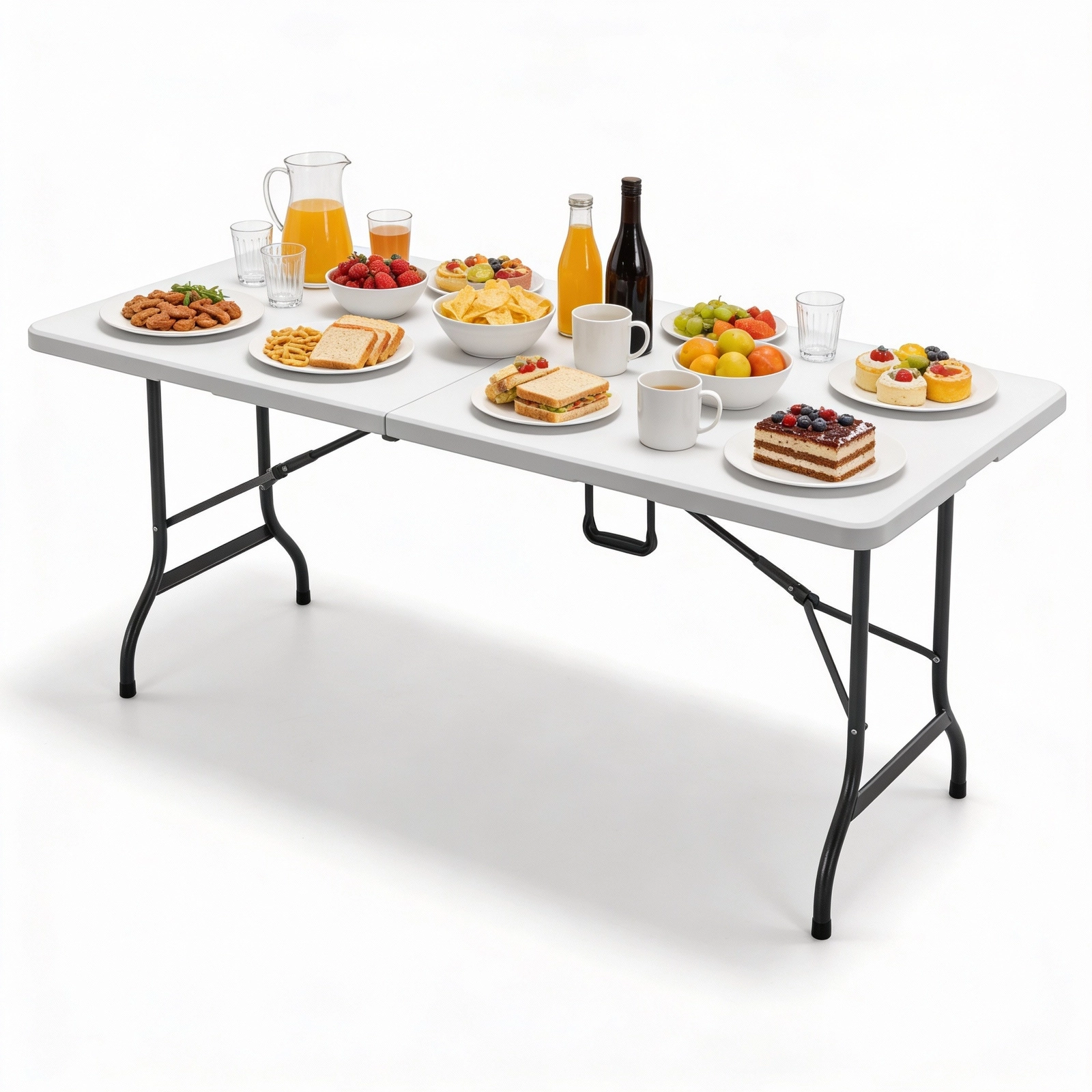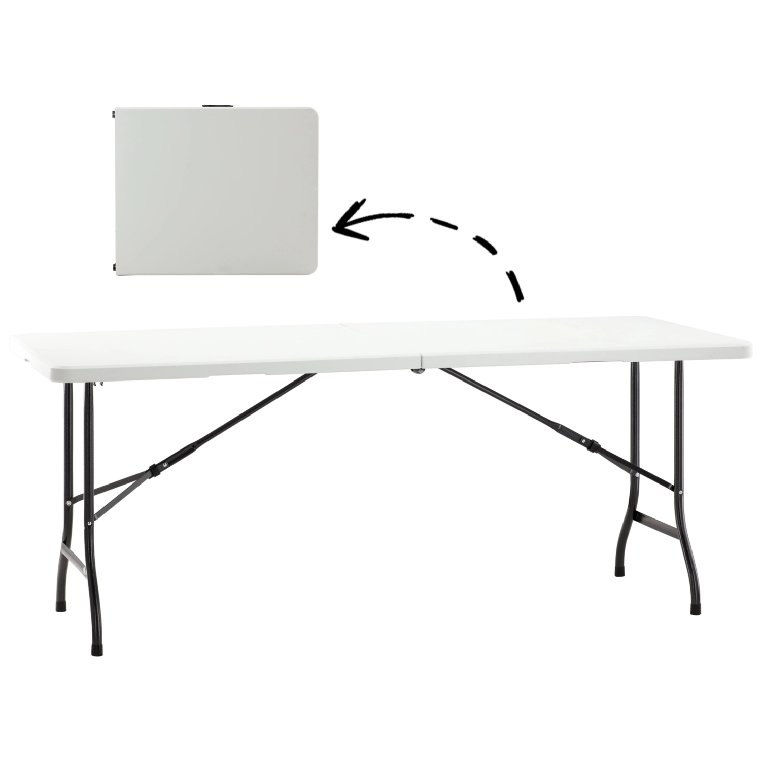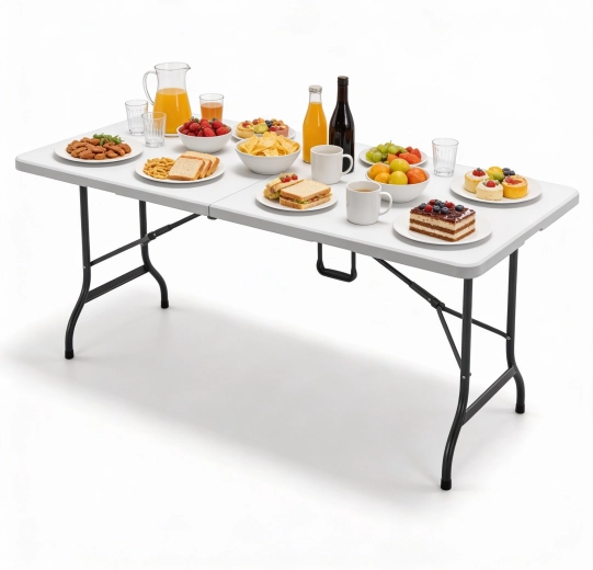 Robuuste opvouwbare tafel met groot werkblad, ideaal voor familiefeesten, bedrijfsevenementen en buitencatering. Het duurzame HDPE-kunststof blad is makkelijk schoon te maken, neemt geen vocht op en is bestand tegen buitenomstandigheden, terwijl het stalen frame met verstevigingen en antislipdoppen stevig op zijn plaats blijft.