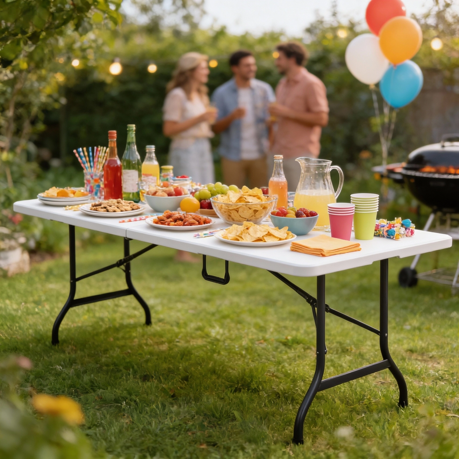 Een lengte van 180 cm en een breedte van 75 cm bieden volop ruimte voor gasten, hapjes en uitrusting – ideaal voor banketten, tuinfeesten en markten.