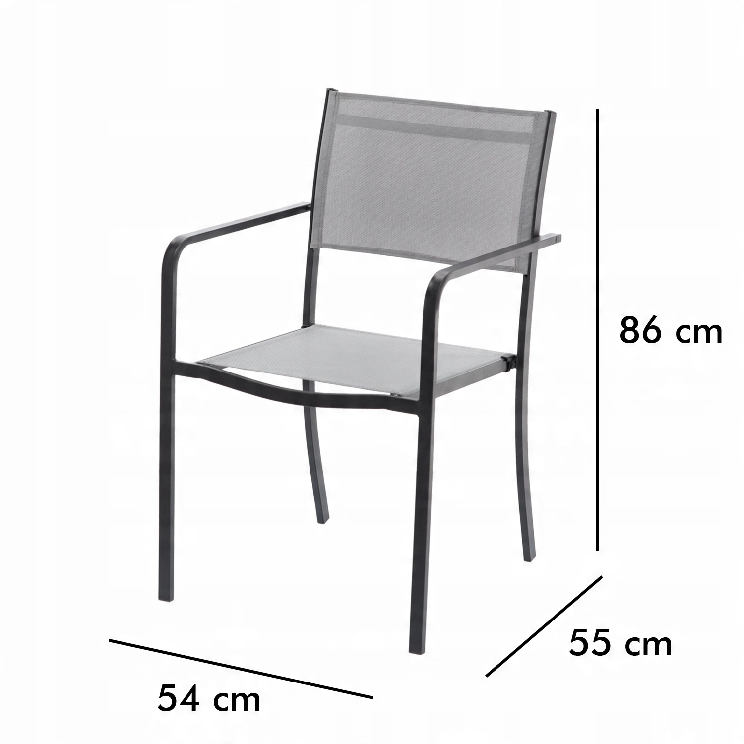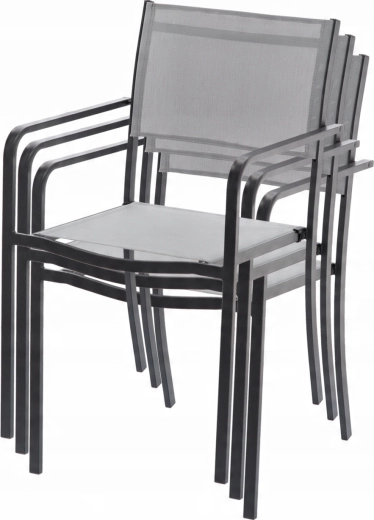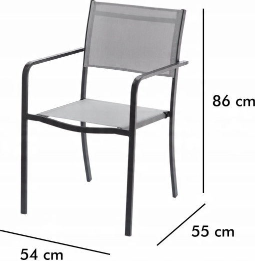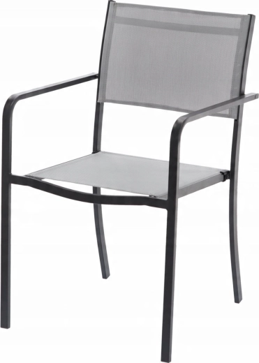 Praktische en elegante tuinstoel met een stabiele stalen constructie en een comfortabele zitting van textilene. Dankzij de mogelijkheid tot stapelen bespaart u ruimte, het stalen frame met poedercoating is weerbestendig en de niet-demontabele constructie zorgt voor uitstekende stabiliteit. De grijze uitvoering is gemakkelijk te combineren met modern buitenmeubilair.