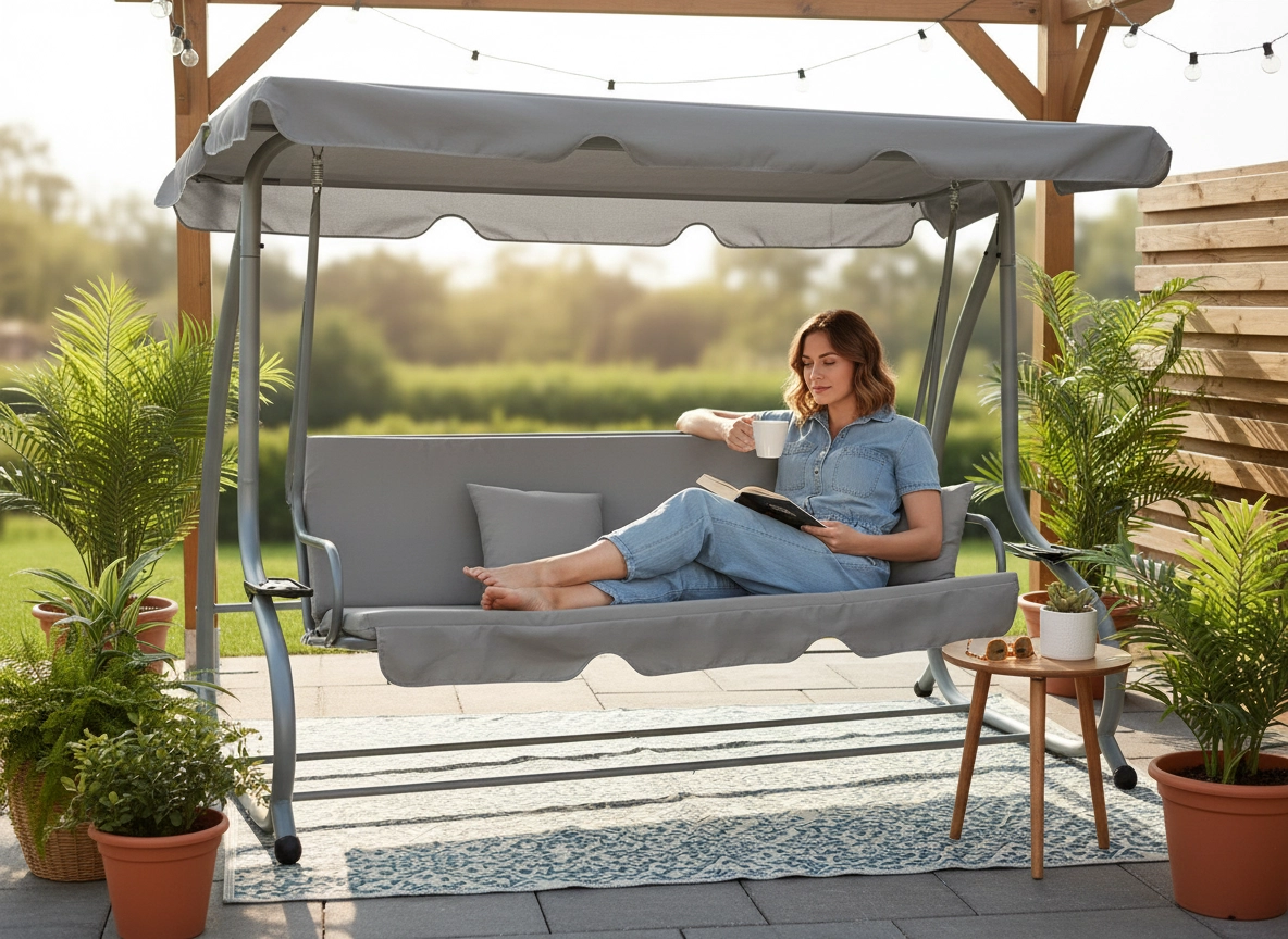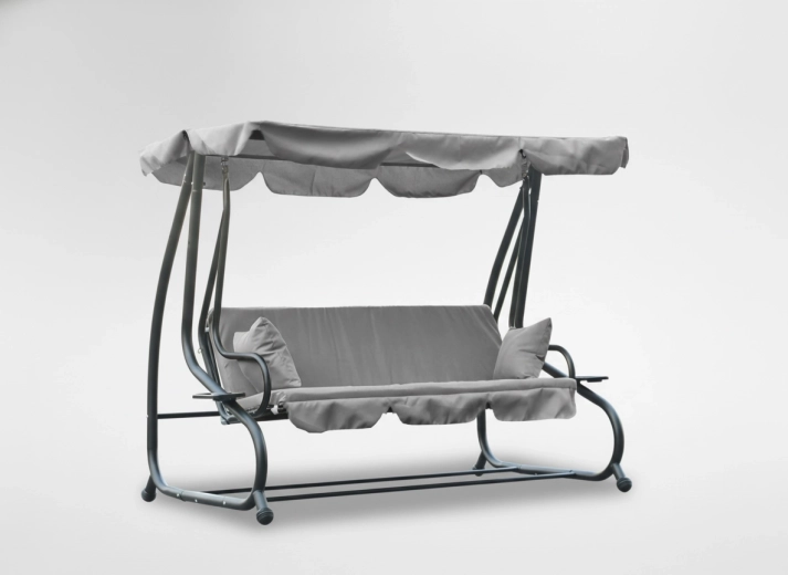 Deze tuinschommel combineert modern design, stabiliteit en een hoog gebruikscomfort. De brede zitting voor drie personen is eenvoudig om te bouwen tot een comfortabele ligplaats, zodat u in een handomdraai de ideale plek voor ontspanning creëert. Gevoerde zittingen en rugleuningen met zacht schuim zorgen voor aangenaam zitten, zelfs bij langdurig gebruik.