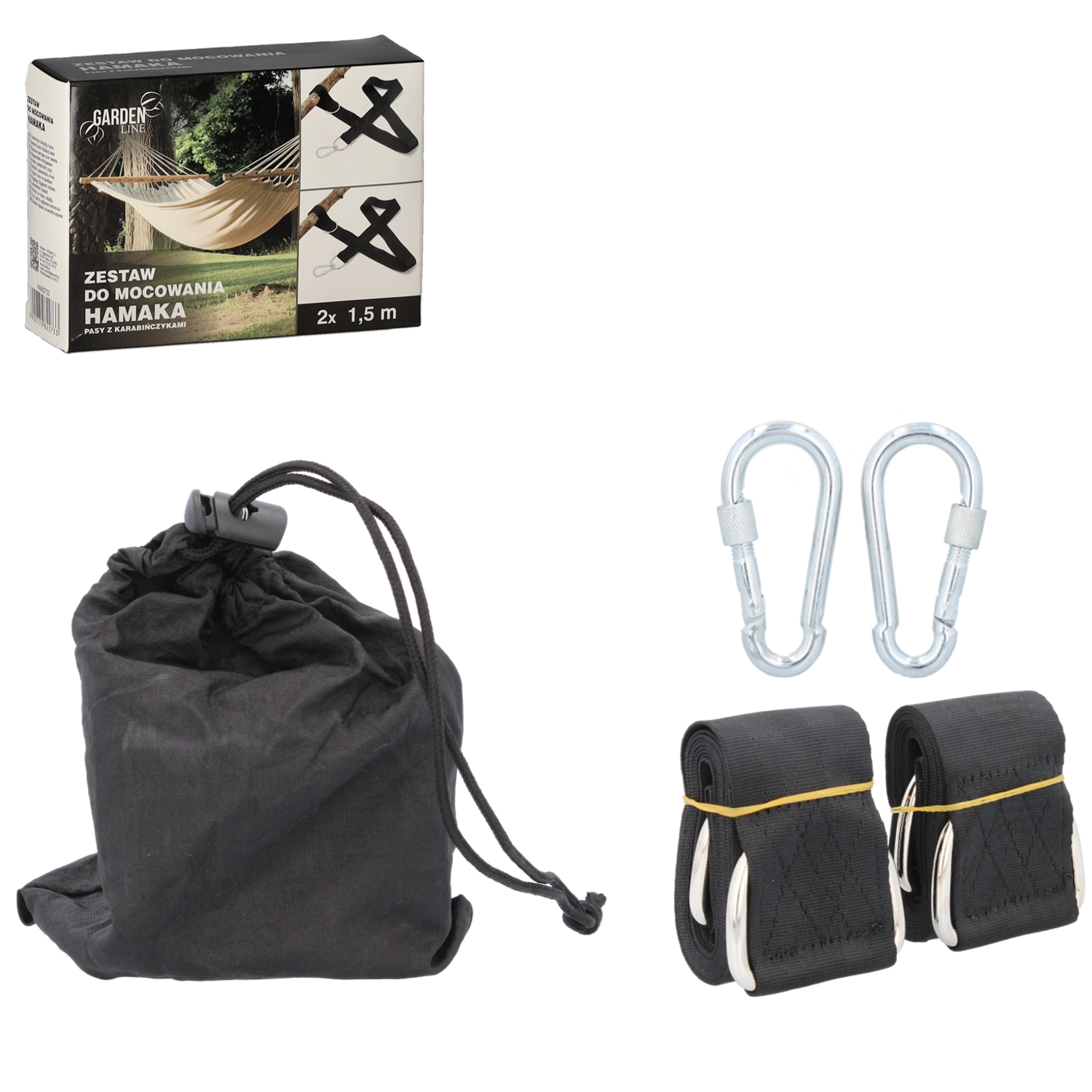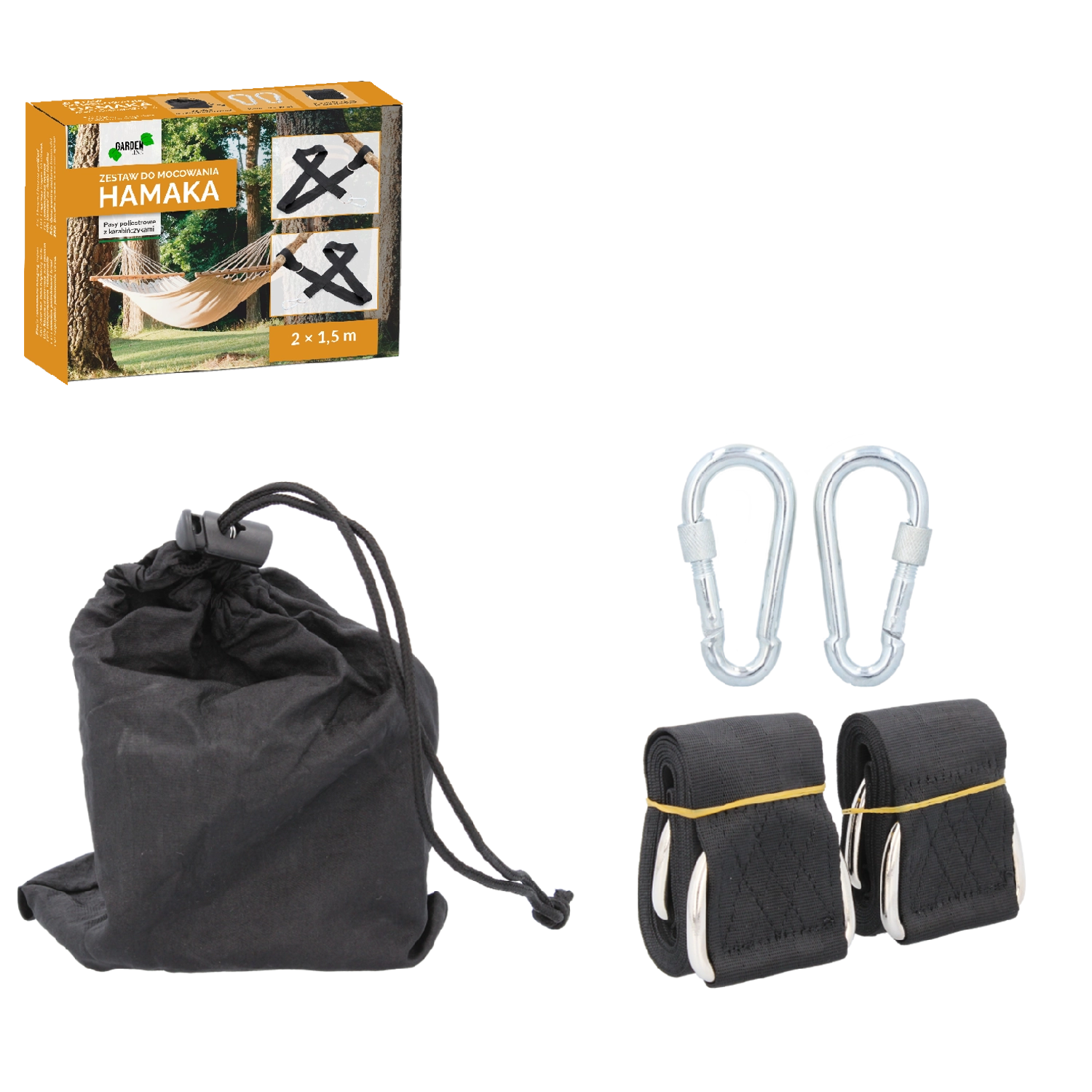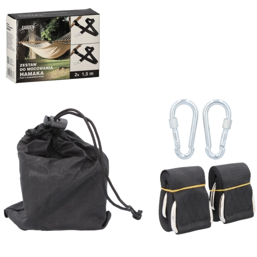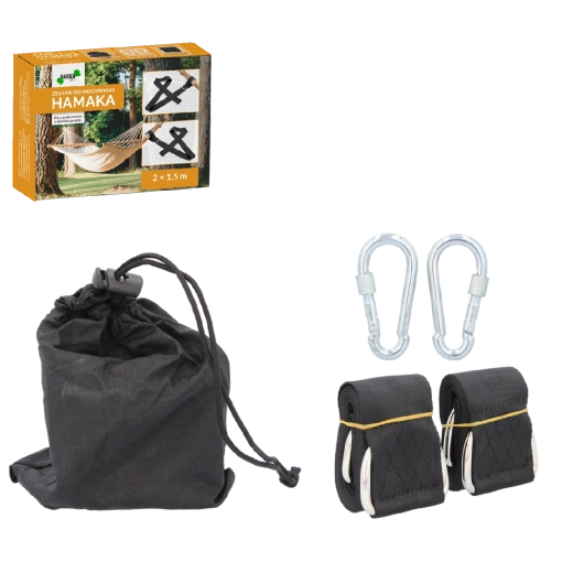 Betrouwbare ophanging van je hangmat binnen enkele minuten. De complete set met riemen, karabiners en haken zorgt voor stabiliteit en comfort in de tuin, op het vakantiehuisje, op het balkon of tijdens het kamperen. Dankzij het hoge draagvermogen en de robuuste uitvoering kun je gerust schommelen en ontspannen.