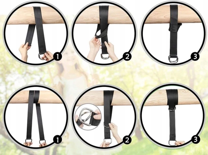 Wikkel de riem om een tak of balk, haal door en zekeren met de karabiner. De eenvoudige werkwijze kan iedereen aan zonder gereedschap.