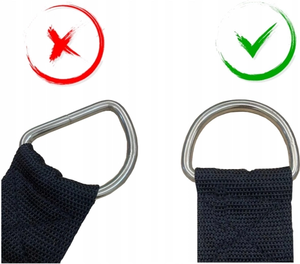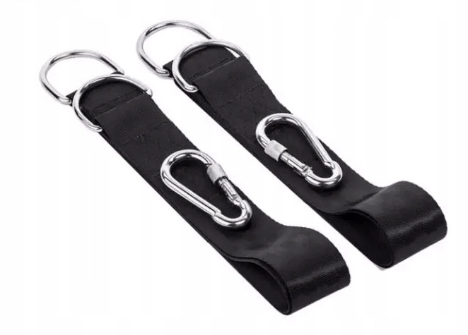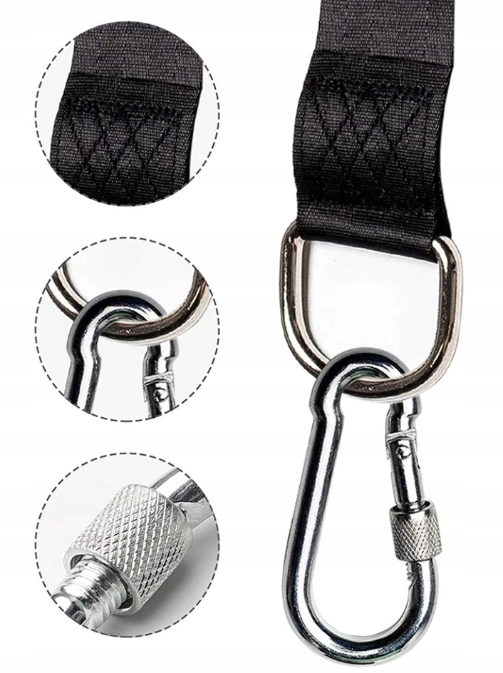 Stevige riemen met metalen D-ringen en schroefkarabiners bieden zekerheid, zelfs bij een hoge belasting tot 1000 kg.