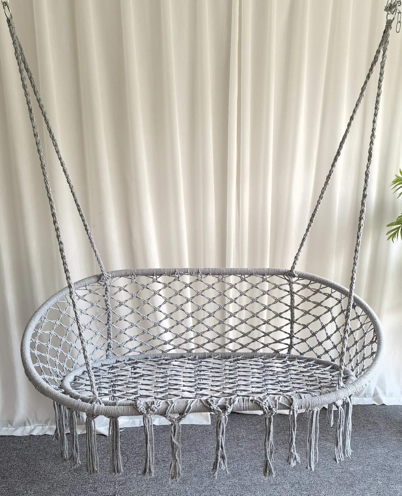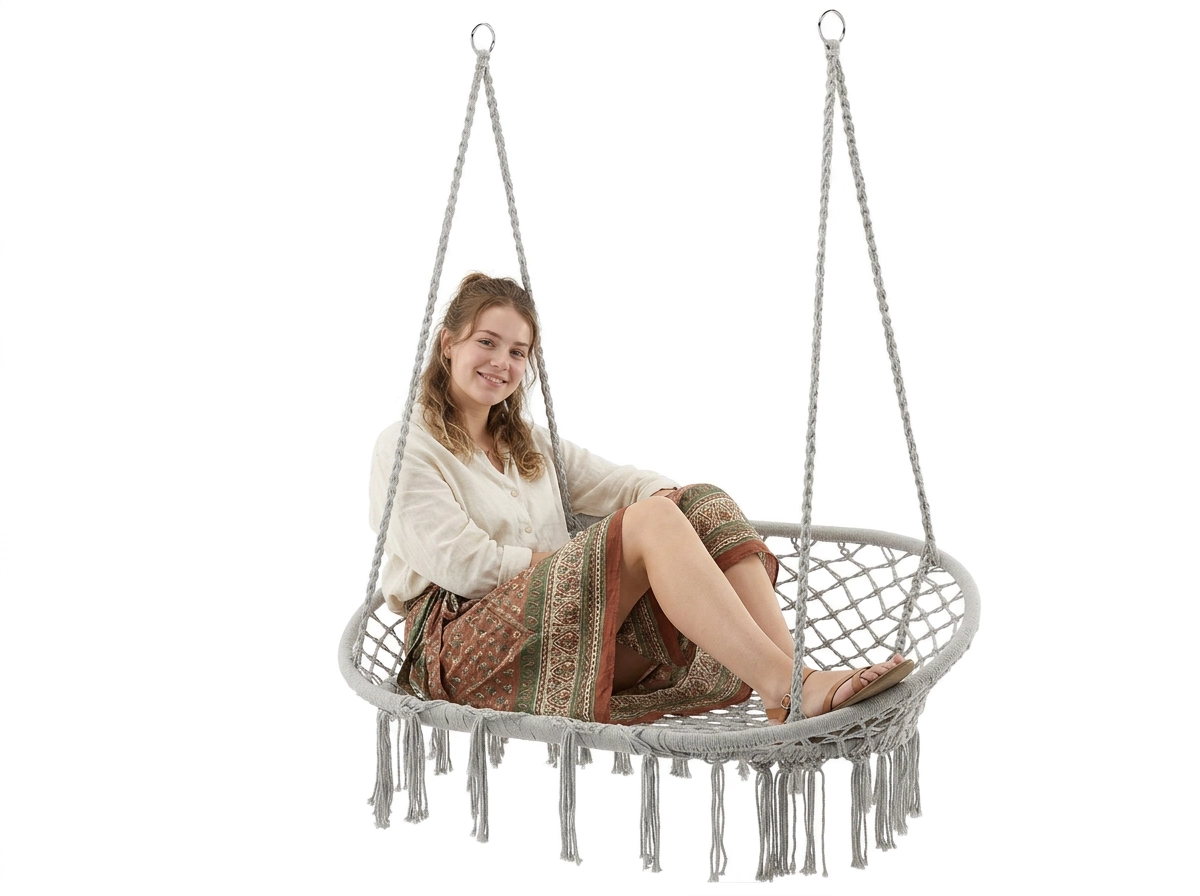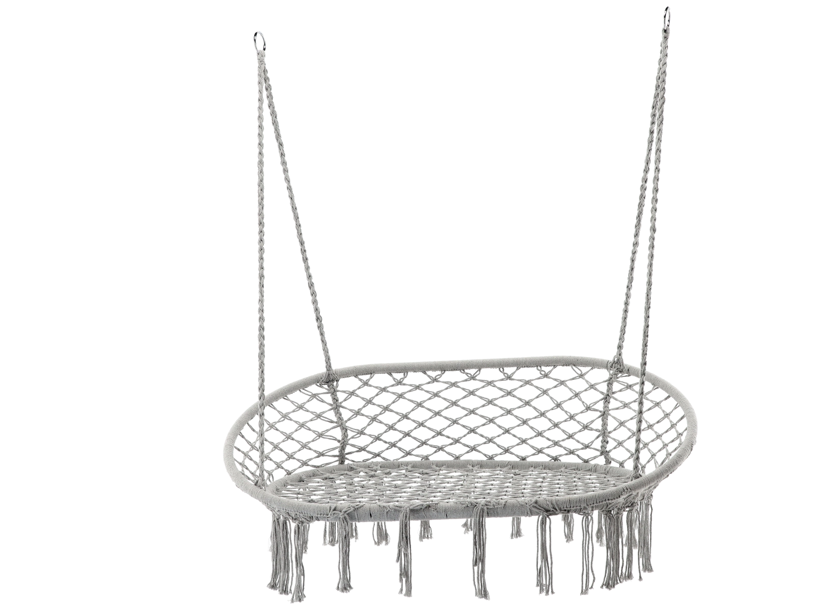Trakteer jezelf op heerlijk schommelen en relaxen met z’n tweeën. De ruime zitting van 110 × 62 cm en de aangename stof in een neutrale grijstint creëren een knusse plek om te lezen, van koffie te genieten of uit te rusten na een drukke dag. Het duurzame, poedergecoate stalen frame zorgt voor sterkte, stabiliteit en een lange levensduur.