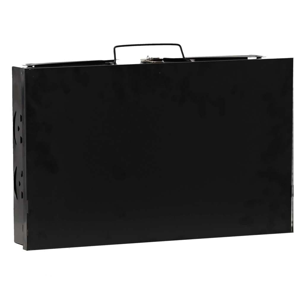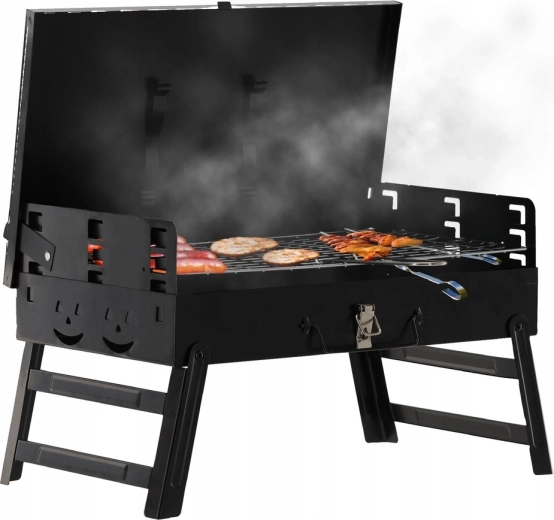 Compacte draagbare houtskoolbarbecue in een praktisch koffermodel voor kamperen, picknicks en de tuin. Dankzij de opvouwbare poten, het vergrendelbare deksel en de geïntegreerde set gereedschap is overal barbecueën comfortabel en veilig. Stabiele constructie, snel op te zetten en makkelijk te dragen besparen ruimte en tijd.