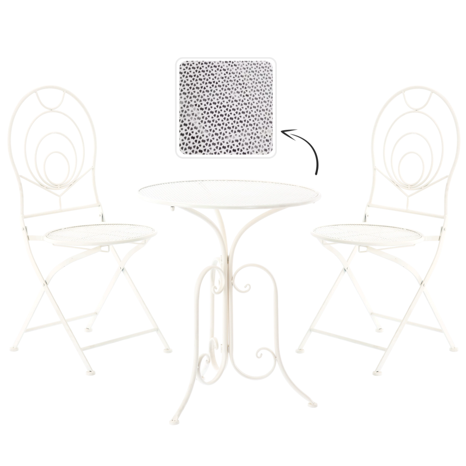 De stoelen zijn inklapbaar, zodat je de set na de koffiepauze snel kunt opruimen, zelfs in een kleinere ruimte. De ronde tafel biedt een prettig oppervlak voor drankjes of decoratie. Dankzij de universele witte kleur en het retro sierelementen past de set in tuinen, cafés en interieurs in vintagestijl.