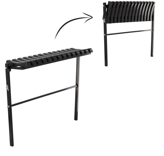 Ingeklapt neemt de bank weinig ruimte in en blijft de omgeving schoon en verzorgd. Montage om in beton te plaatsen biedt hoge stabiliteit en veilig gebruik. De zitting met lattenprofiel is ook bij langer zitten comfortabel.