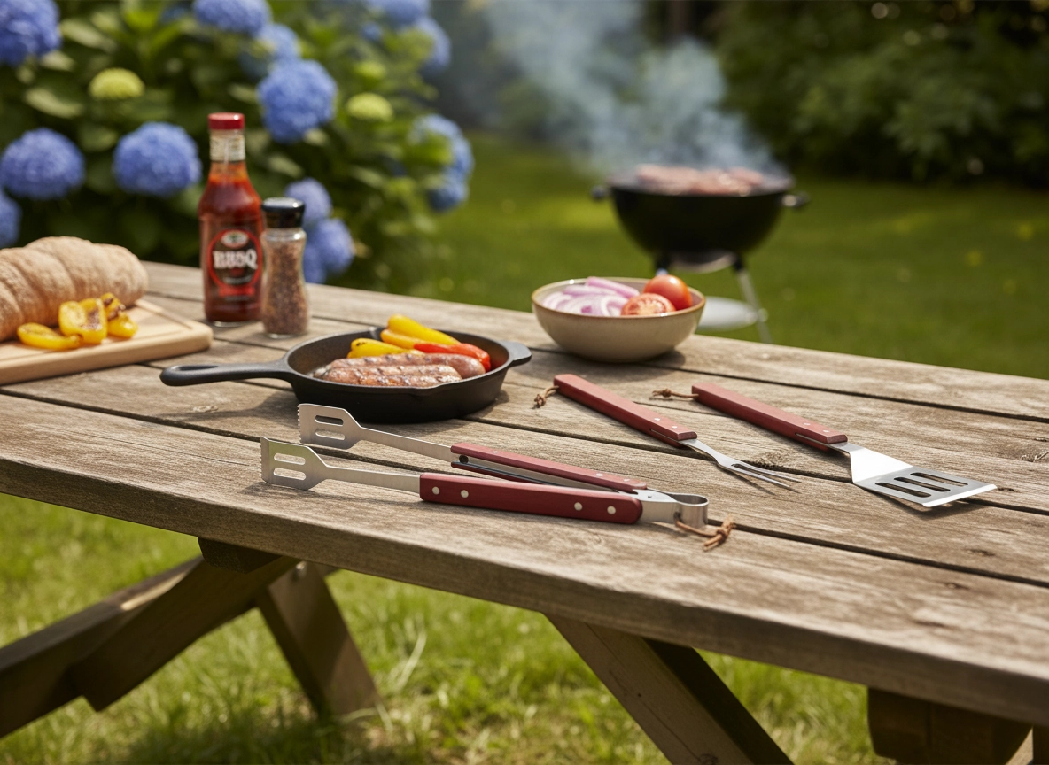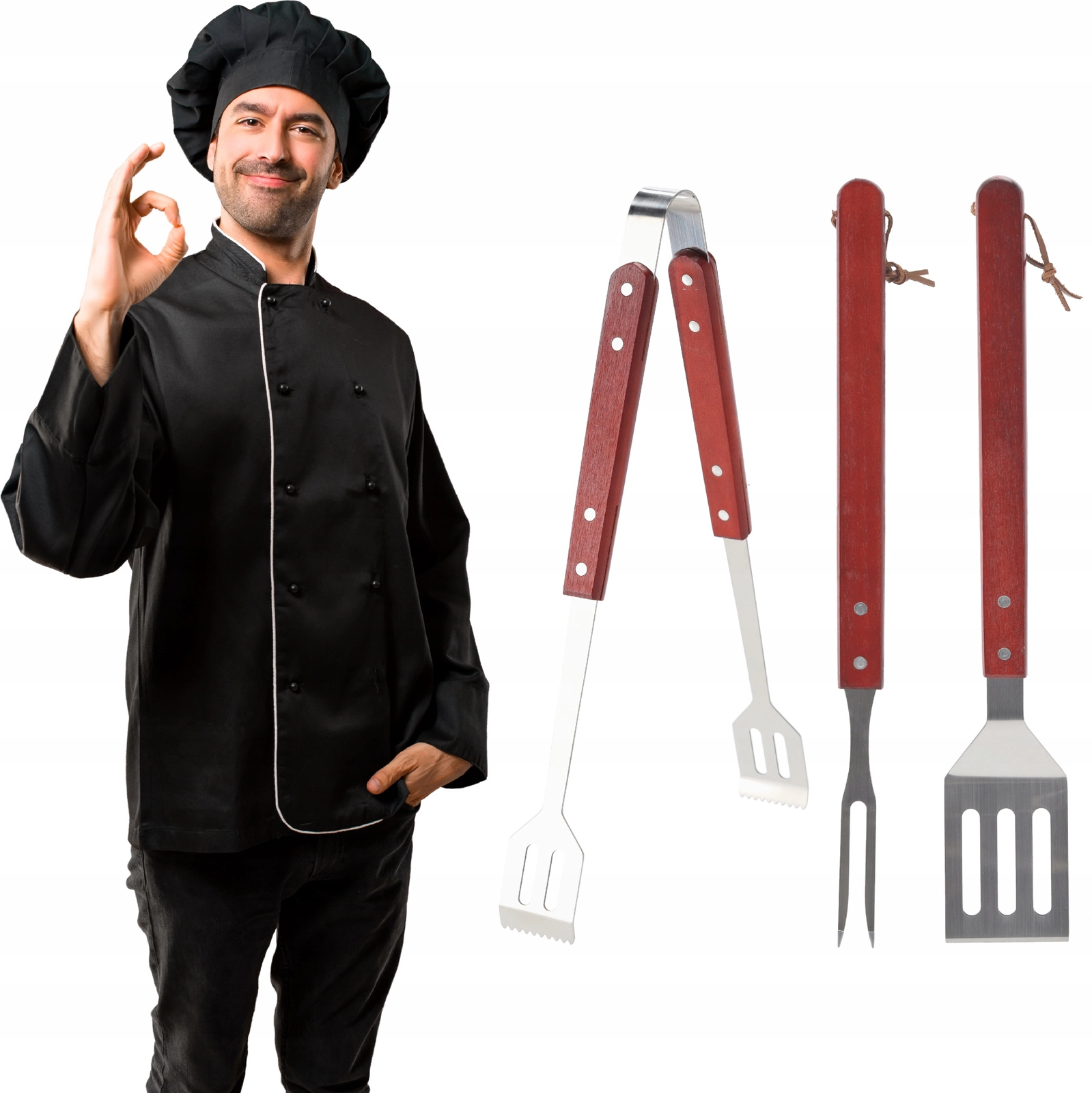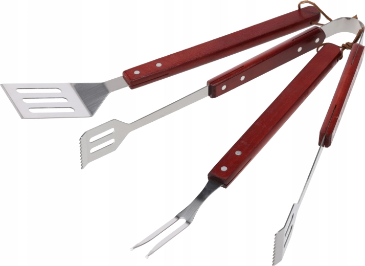 Praktische set voor elke grillliefhebber: drie onmisbare tools van roestvrij staal met ergonomische houten handgrepen. Een spatel voor eenvoudig draaien, een tang voor een zekere grip en een vork voor het aanprikken en fixeren van vlees – alles ontworpen voor veilig en comfortabel gebruik bij de barbecue.
