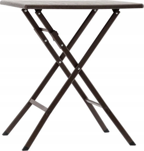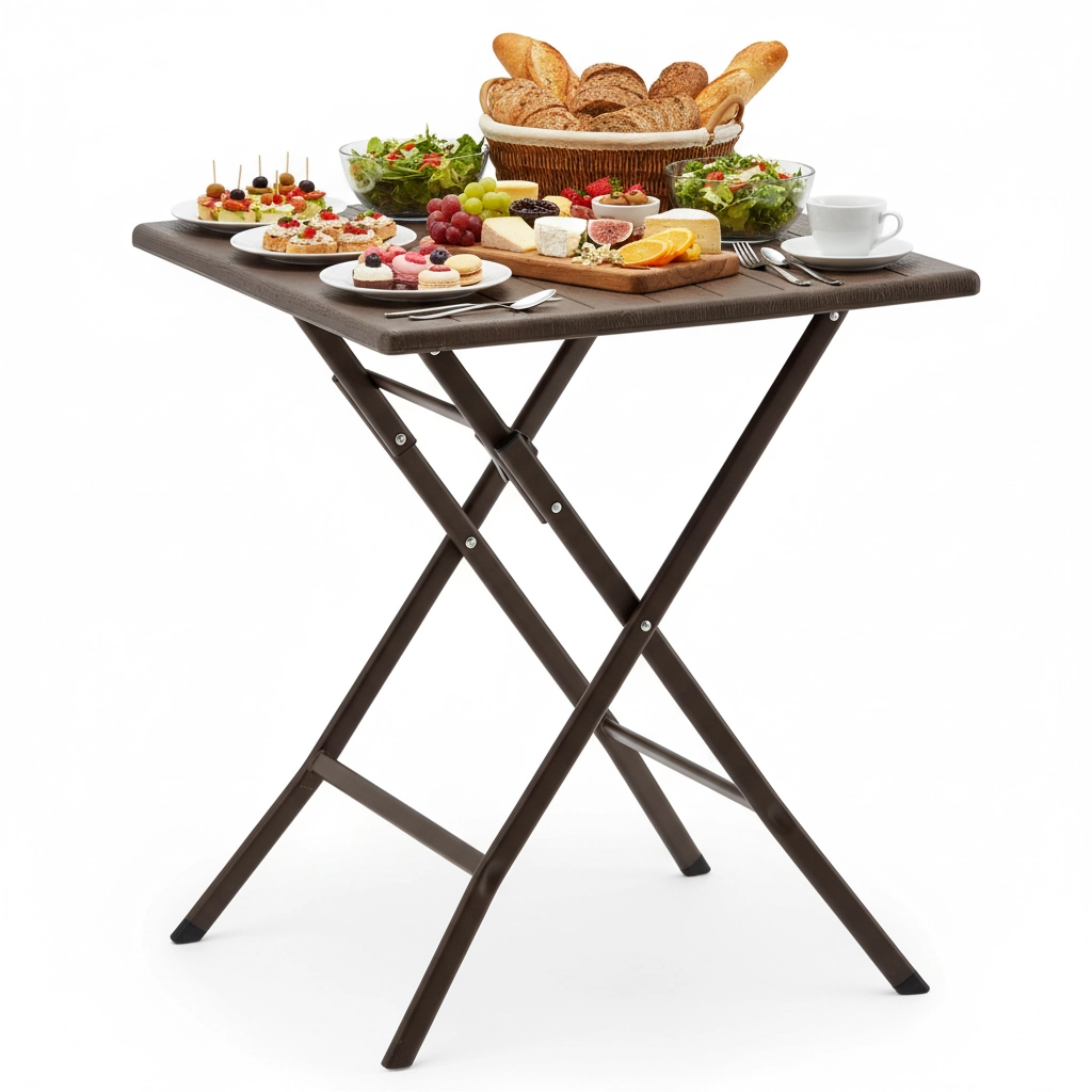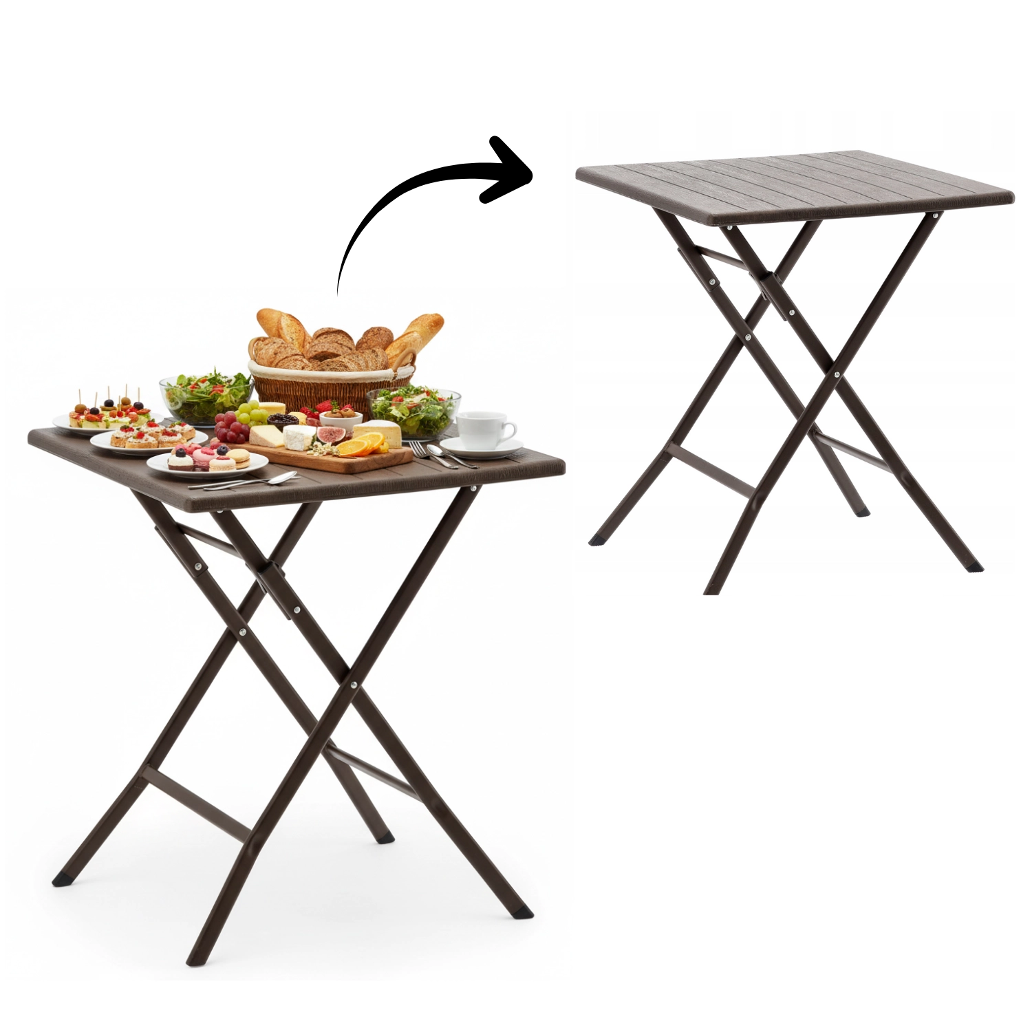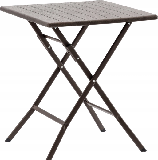Praktische opvouwbare kampeertafel met afmetingen 61,5 × 61,5 × 73 cm, die een licht gewicht combineert met hoge stabiliteit. Het oppervlak in een bruine houttint past moeiteloos bij je tuinmeubilair en dankzij de opvouwbare poten berg je hem in een handomdraai op, zelfs in kleine ruimtes.