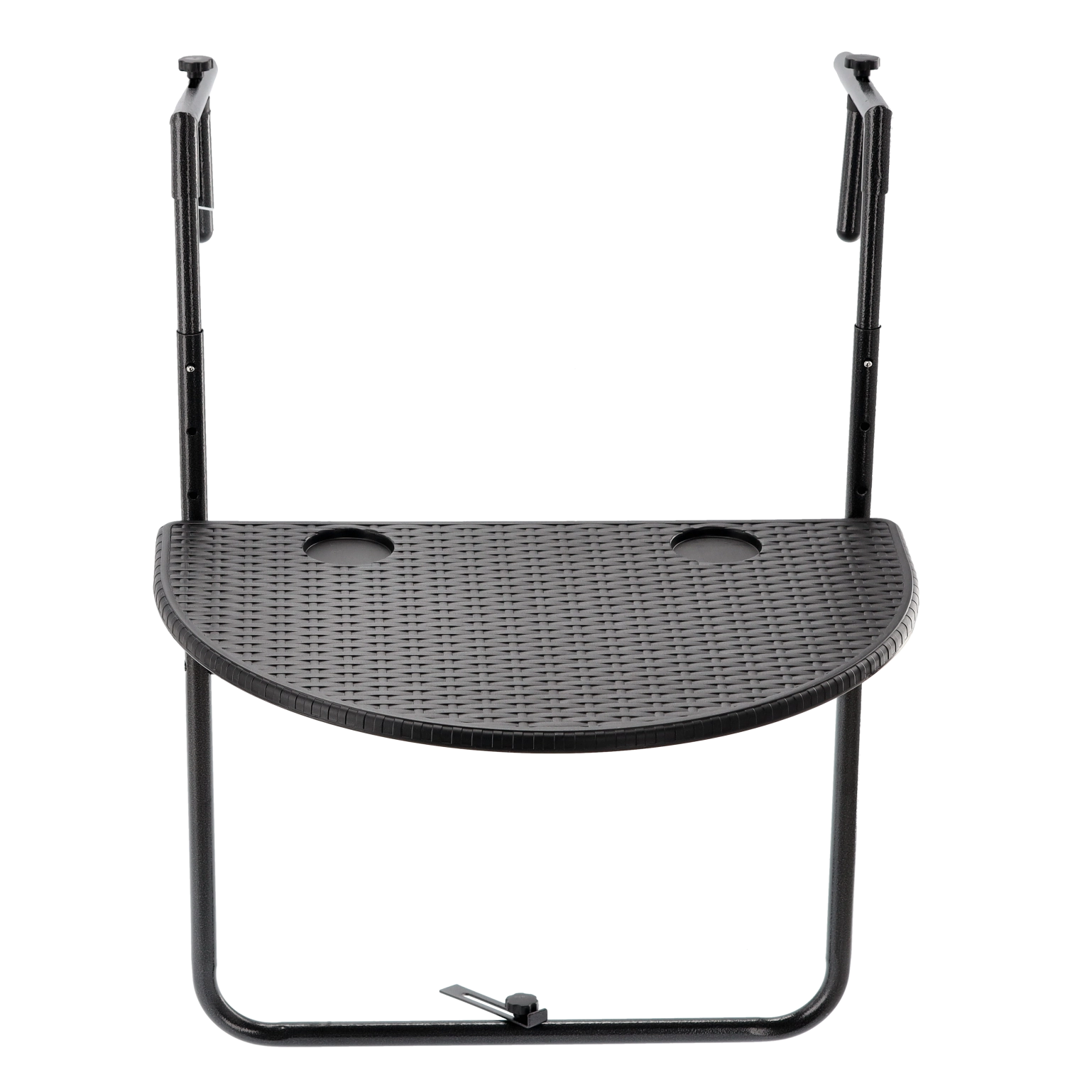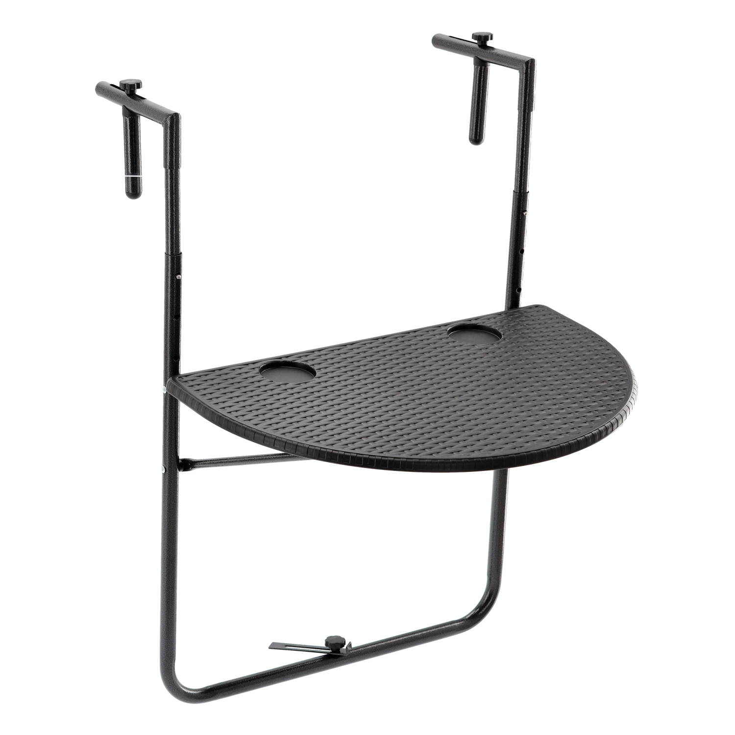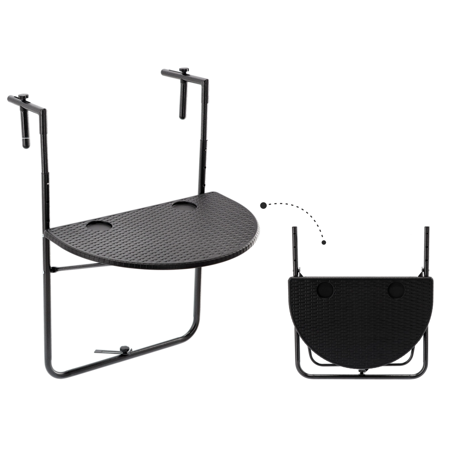 Praktische hangende balkontafel die ruimte bespaart en zelfs een klein balkon omtovert tot een knusse zitplek. Dankzij de opklapbare constructie, de halfronde vorm en de verstelbare hoogte van 73–78,5–83,5 cm geniet je van comfort bij koffie, werk en relaxen. Het duurzame metalen frame en het blad in zwarte rattan-look ogen elegant en zijn gemakkelijk te onderhouden.