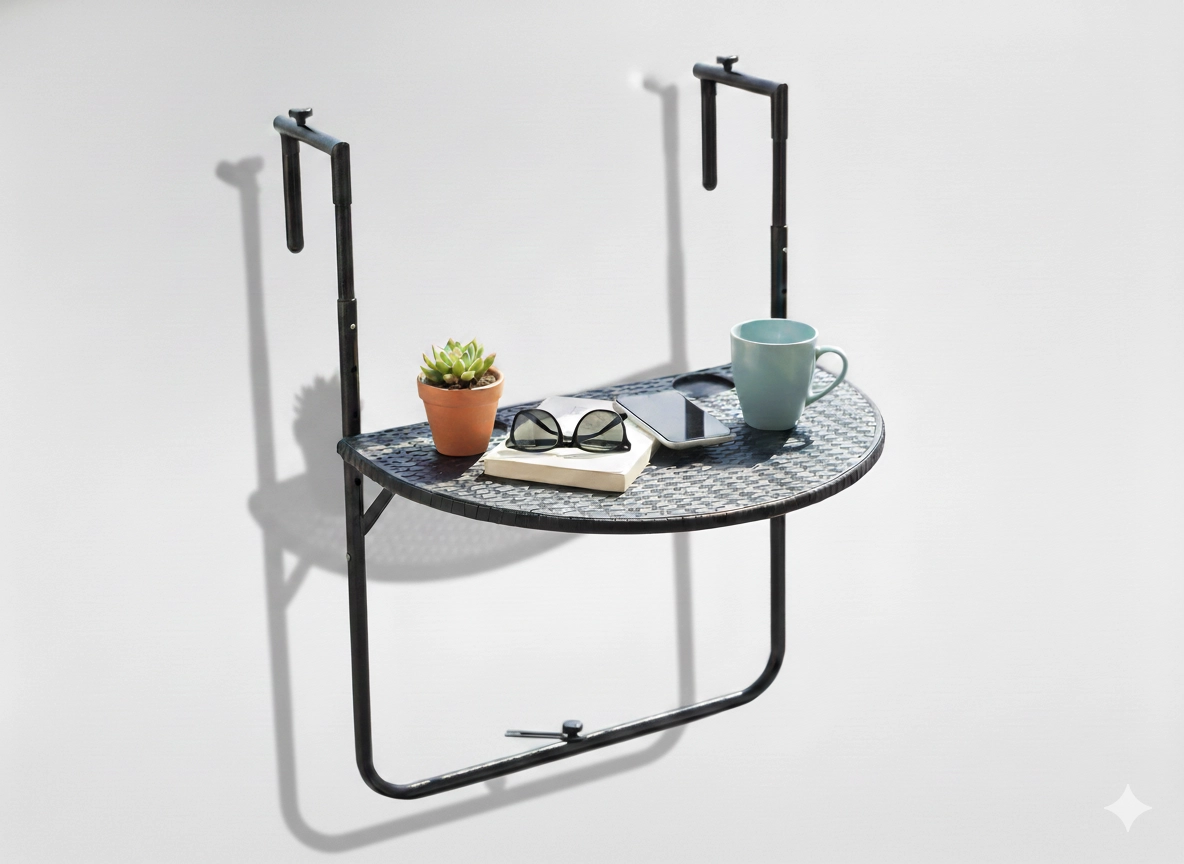 De hangtafel bevestig je eenvoudig aan de balkonleuning met verstelbare houders. De halfronde vorm bespaart slim ruimte, terwijl de geïntegreerde bekeropeningen glazen veilig op hun plaats houden. Na gebruik klap je de tafel met één beweging omlaag – de ideale oplossing voor kleine balkons.