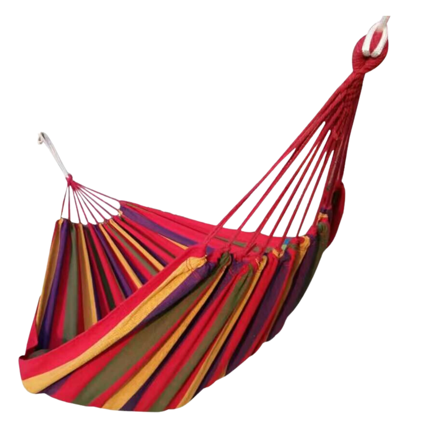 Geniet van welverdiende ontspanning in de tuin, op het terras of balkon met deze comfortabele hangmat in rode strepen. Gemaakt van een duurzame mix van polyester en katoen, met royale afmetingen van 200 × 100 cm en een draagvermogen tot 150 kg voor veilig en comfortabel relaxen.