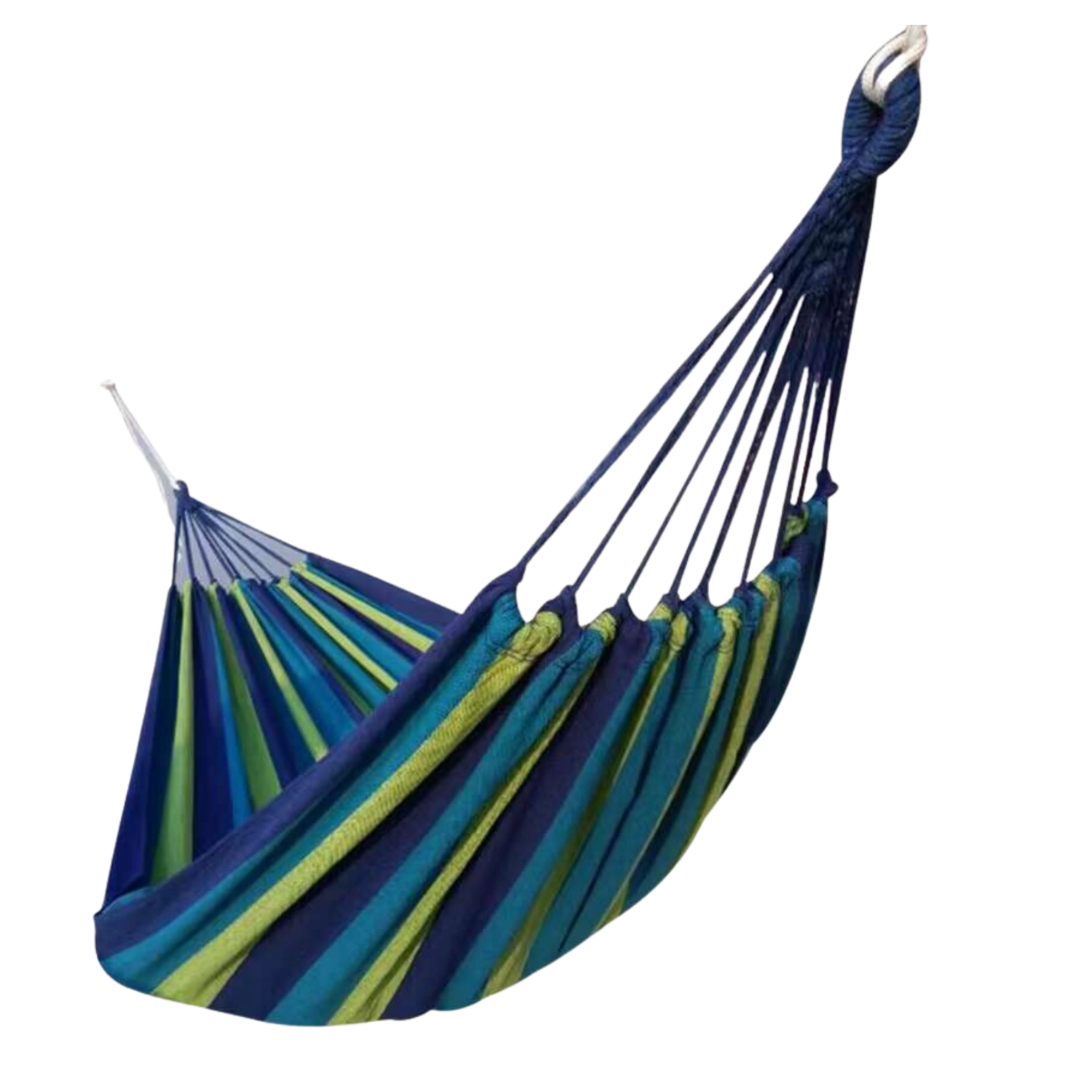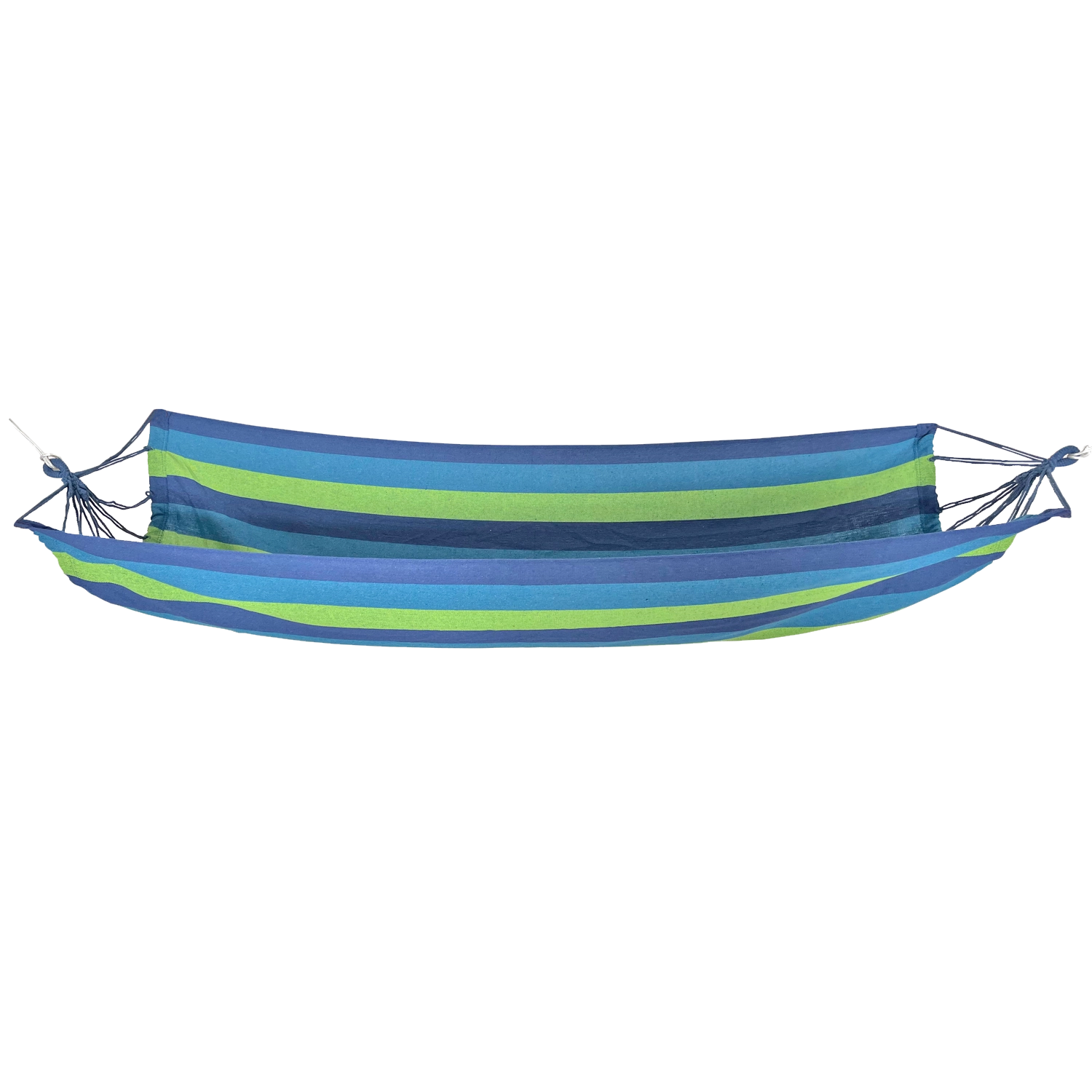 De ruime en comfortabele hangmat is gemaakt van een mix van polyester en katoen, die zacht aanvoelt, goed ademt en tegelijk vormvast blijft. De blauwe strepen geven elke ruimte een vakantiesfeer.