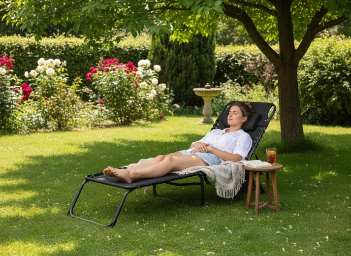 De ligstoel vouw je in een handomdraai op en draag of berg je zonder moeite op. Perfect voor tuin, balkon, kamperen en strand.