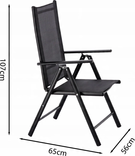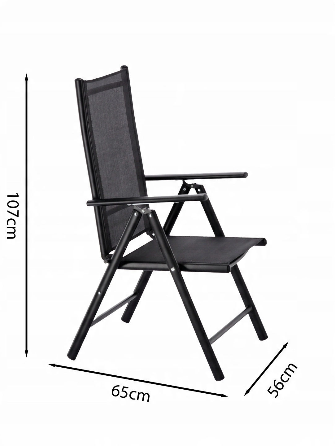 Elegante en lichte tuinstoel met een sterke aluminium constructie, voorzien van 7-voudig verstelbare rugleuning, ademende textilene stof voor comfortabel zitten en een opvouwbaar ontwerp voor eenvoudig opbergen en meenemen. De slijtvaste afwerking en comfortabele armleuningen zorgen voor lange levensduur en comfort op het terras, balkon en in de tuin.
