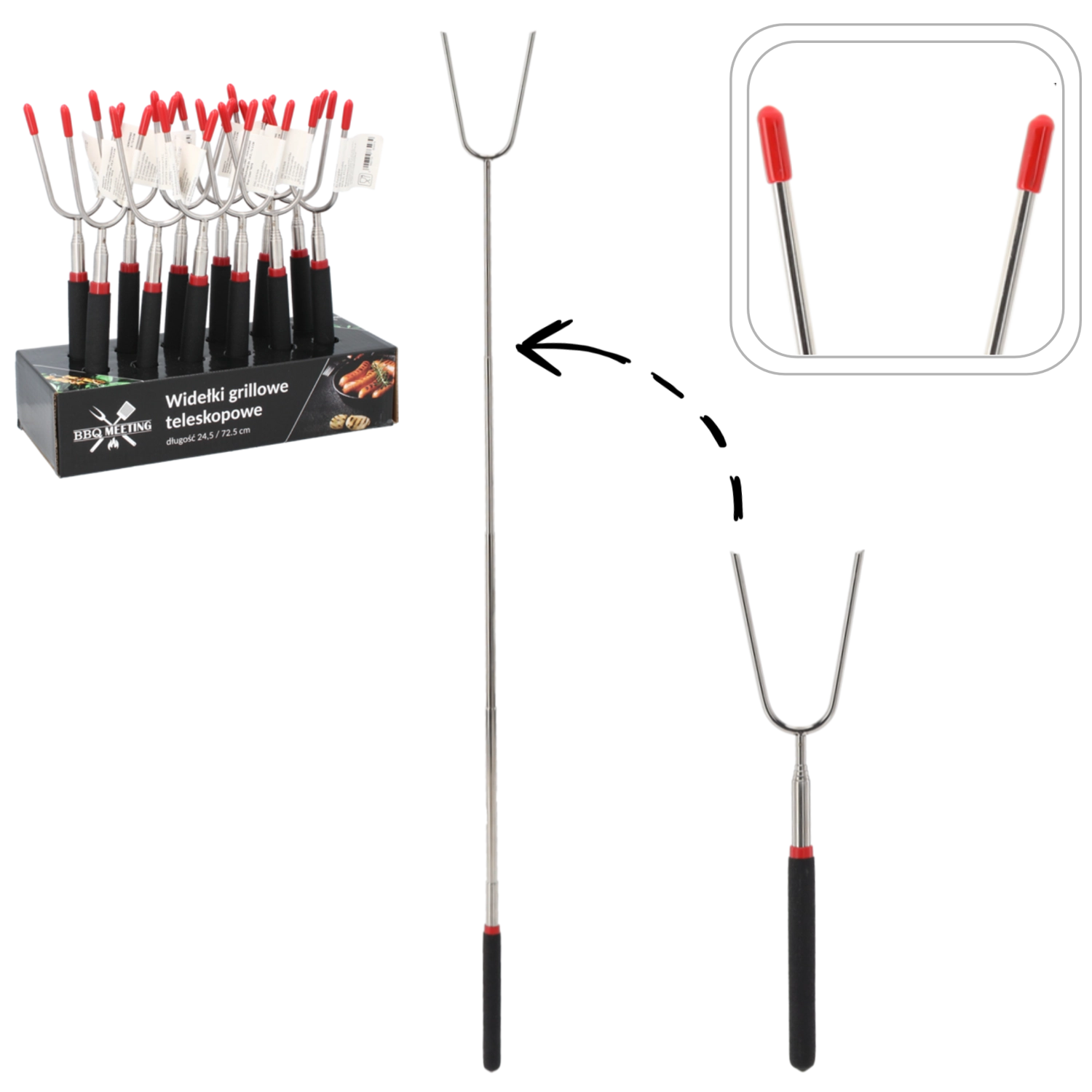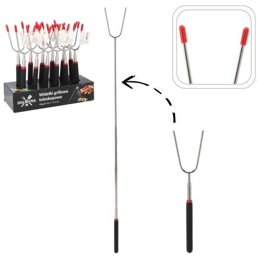 Praktische uitschuifbare vorken voor comfortabel roosteren bij het kampvuur en op de grill. Dankzij de verstelbare lengte van 24,5–72,5 cm blijf je op veilige afstand van de vlammen, terwijl het dubbelpuntige design worstjes, marshmallows of groenten stevig op hun plaats houdt. Ideaal voor kamperen, picknicks en tuinbarbecues.