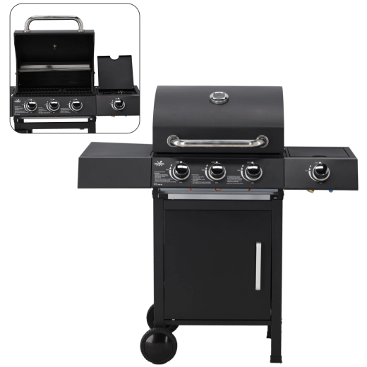 Geniet van zorgeloos barbecueën met een gasbarbecue met een vermogen van 10,3 kW, 3 hoofdbranders en een zijbrander. Dankzij de snelle opwarming, het ruime grilloppervlak en de meegeleverde regelaar met slang kun je direct na het uitpakken beginnen. De robuuste deksel met thermometer, praktische aflegvlakken en wielen voor eenvoudig verplaatsen maken deze barbecue ideaal voor tuinfeesten en familiediners.
