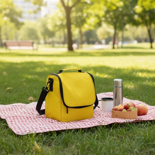 De stijlvolle gele koeltas is een uitstekende keuze voor dagelijks gebruik en weekendactiviteiten. Dankzij de effectieve isolatie en 2 herbruikbare koelelementen blijft de inhoud langer koel – ideaal voor lunches, snacks of drankjes voor onderweg.