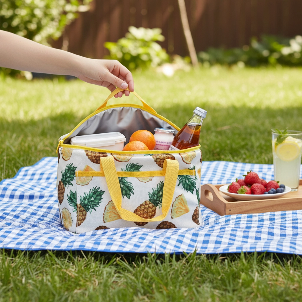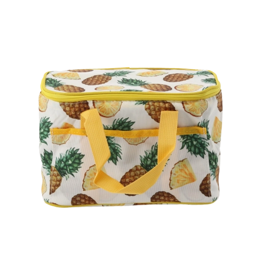 Geniet overal van verse snacks en drankjes. Deze stijlvolle isothermische tas van 6 l met een aantrekkelijke ananasprint combineert laag gewicht, duurzaam materiaal en uitstekende isolatie. De twee meegeleverde koelelementen verlengen het koelende effect op warme dagen.