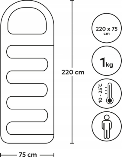 Dankzij een gewicht van rond de 1 kg en de meegeleverde compressiezak is hij ideaal voor kamperen, festivals, overnachten in een hut en reizen. De duurzame rits vergemakkelijkt ventilatie en bediening, terwijl het royale formaat van 220 × 75 cm ook langere gebruikers comfort biedt.