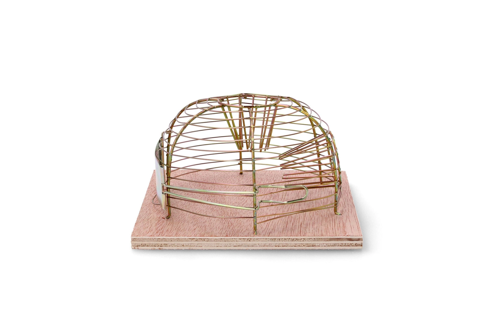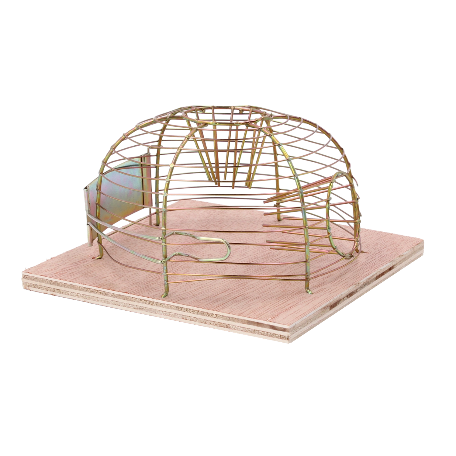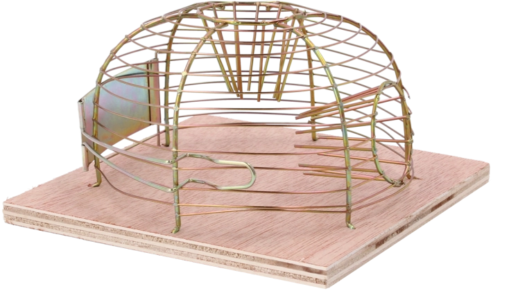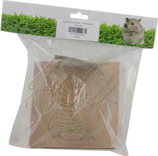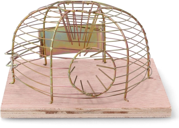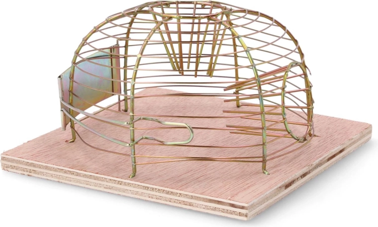 Deze levend vangende val maakt veilige vangst van muizen en vervolgens vrijlaten op voldoende afstand mogelijk. De open draadkoepel zorgt voor goede zichtbaarheid en ventilatie, terwijl de houten basis stabiliteit biedt op vlakke oppervlakken.
