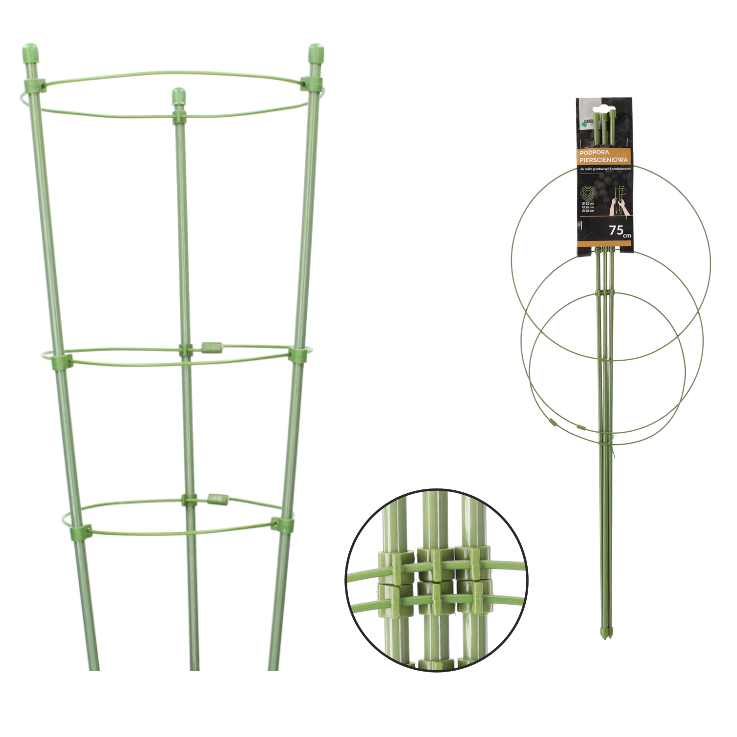 Ronde plantensteun met een hoogte van 75 cm zorgt voor een stabiele groei van struiken en bloemen in potten en in borders. Gemaakt van duurzaam staal met polyethyleen coating, waardoor hij bestand is tegen weersinvloeden en resistent tegen beschadiging. Dankzij de groene kleur gaat hij op in het bladerdek en blijft hij bijna onzichtbaar. Drie ringen voorkomen effectief het omvallen of neerliggen van planten en ondersteunen een harmonieuze, rechtopstaande groei.