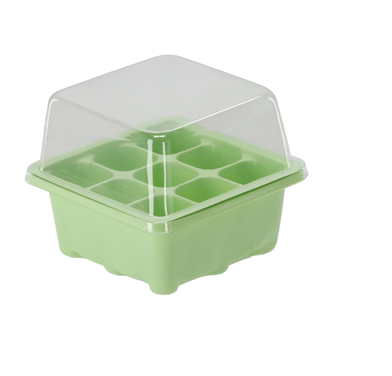 De verdeelde zaaitray met 9 vierkante cellen (ca. 3,5 × 3,5 cm) maakt kiemen, verzorging en later verplanten van zaailingen eenvoudiger.