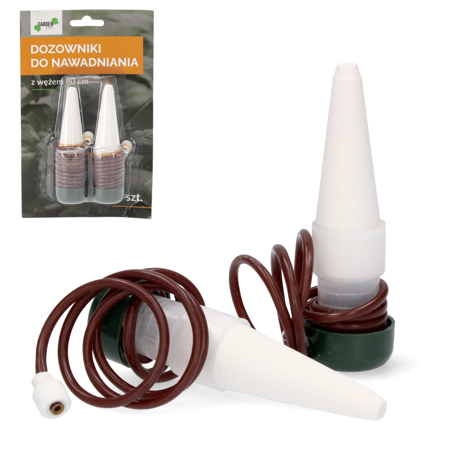 Praktische set voor zorgeloze plantenverzorging: 2 automatische irrigatiedoseerders met een slang van 80 cm houden de bodemvochtigheid optimaal, zelfs tijdens uw afwezigheid. Eenvoudige installatie, betrouwbare watertoevoer voor kamer-, balkon- en kasplanten.