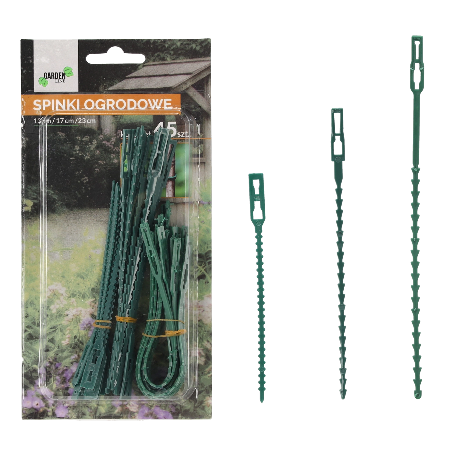Praktische set van 45 tuinklips in lengtes van 13, 17 en 23 cm voor het betrouwbaar vastzetten van planten aan steunen zonder de stengels te beschadigen. Duurzaam en flexibel kunststof zorgt voor herhaald gebruik, terwijl de groene kleur onopvallend opgaat in borders, kassen en op balkons.