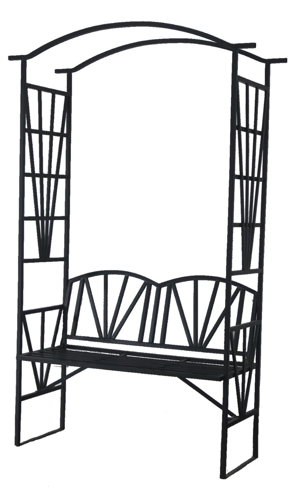 Elegante tuinpergola met geïntegreerd bankje die elke hoek van de tuin omtovert tot een knusse plek om te ontspannen. Dankzij de stevige metalen constructie en poedergecoat staal is hij weerbestendig, terwijl de zijwaartse tralies voor klimplanten zorgen voor natuurlijke groene schaduw en een decoratief accent.