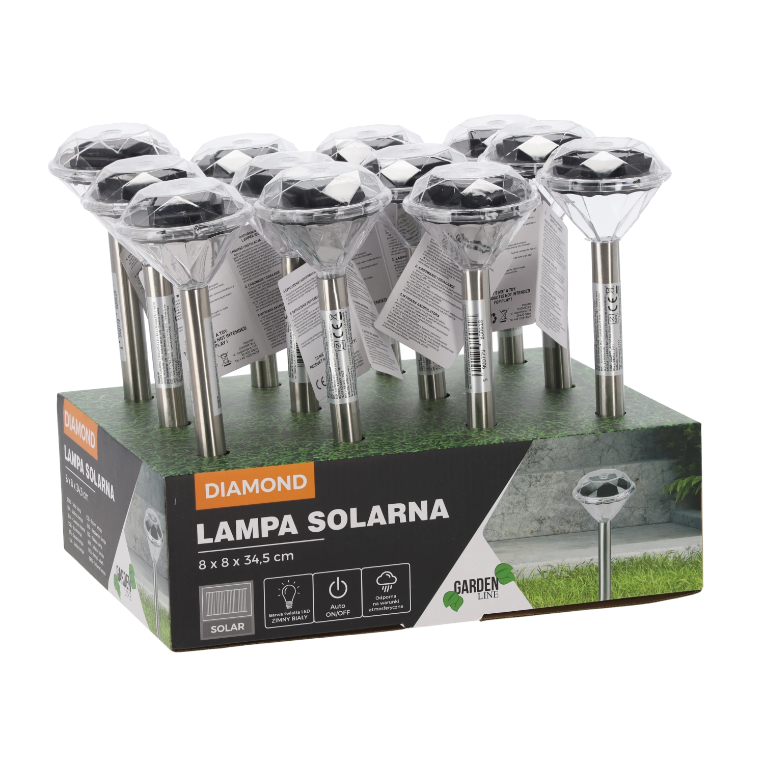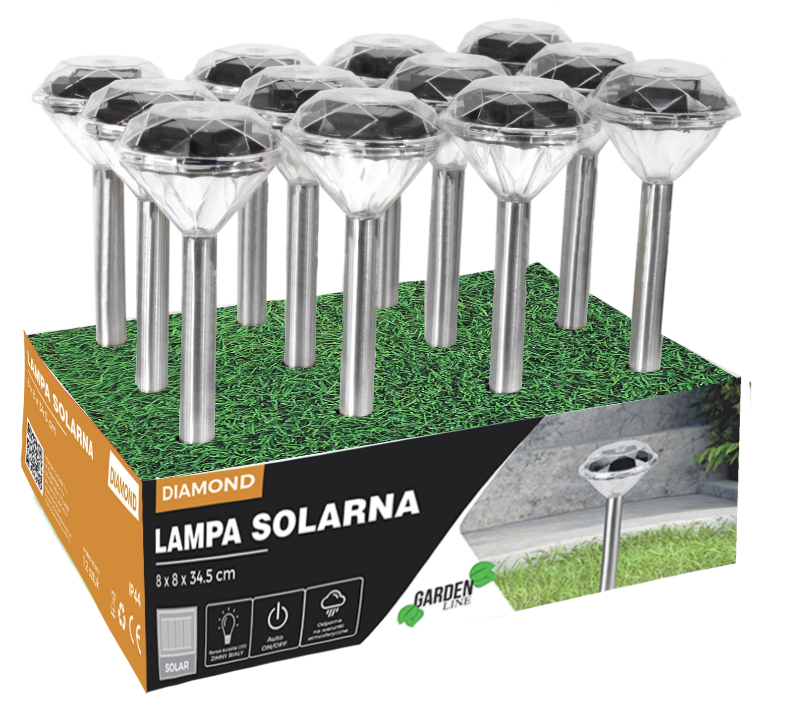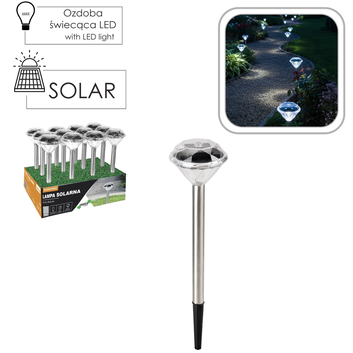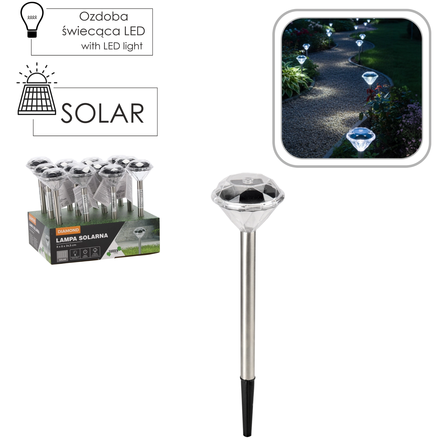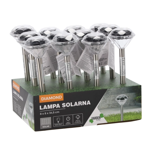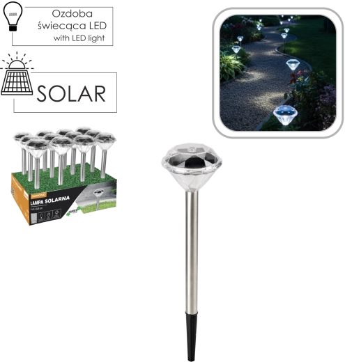 Stijlvolle zonne-energielamp DIAMOND met witte LED is ideaal voor het verlichten van tuinpaden, terrassen en opritten. Dankzij zonne-energie is ze draadloos, zuinig en weerbestendig (IP44). Het roestvrijstalen ontwerp in satijnafwerking en de eenvoudige installatie met een grondpen zorgen voor een snelle en elegante buitenverlichtingsoplossing zonder extra kosten.