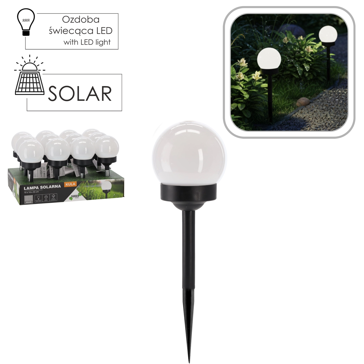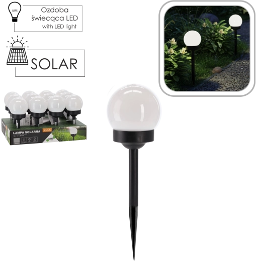 Stijlvolle zonne-LED-lamp in bolvorm, ideaal voor het verlichten van tuinpaden, terrassen en opritten. Werkt op zonne-energie, dus geen kabels of extra kosten nodig. Dankzij automatisch opladen en IP44-bescherming brandt hij betrouwbaar bij elk weertype en is hij eenvoudig te installeren met de grondpen.