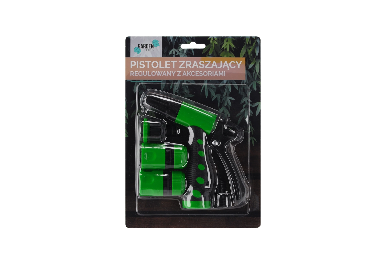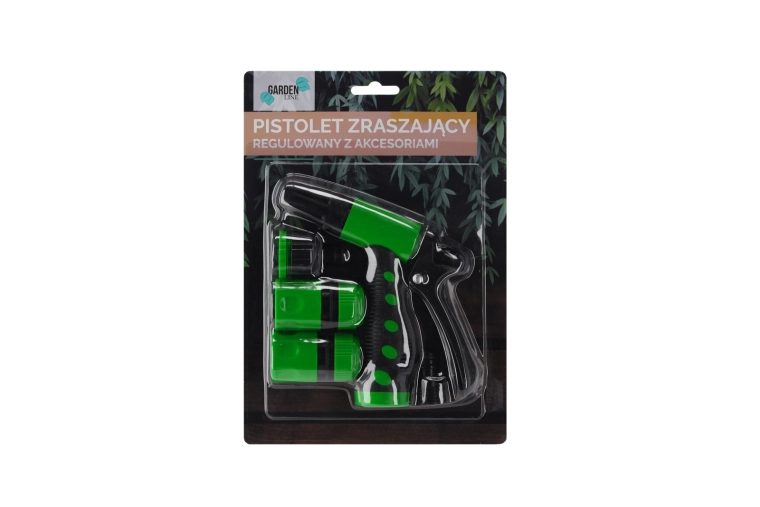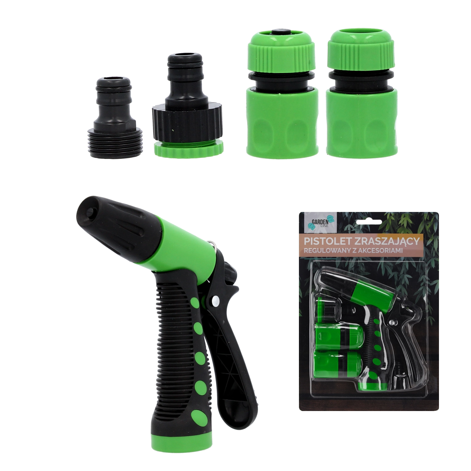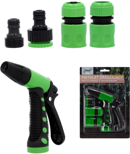 - Verstelbaar sproeipistool; 1/2" snelkoppeling met stop; 1/2" snelkoppeling zonder stop; kraanadapter 1/2"–3/4"