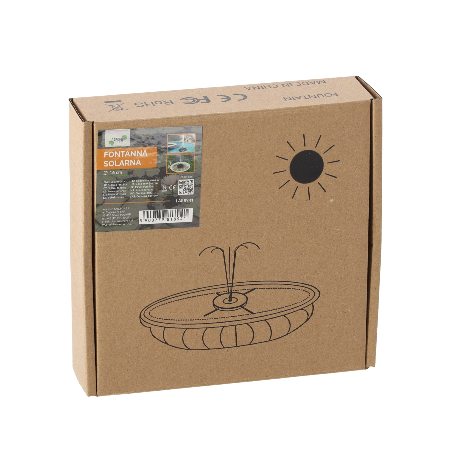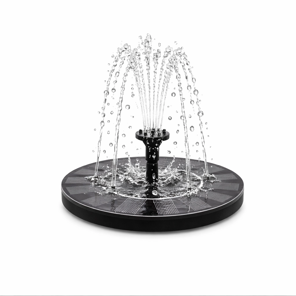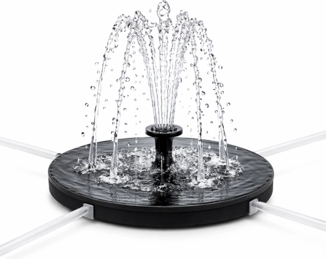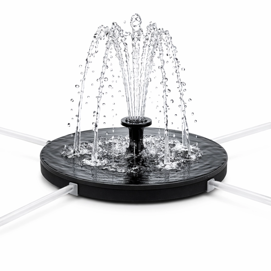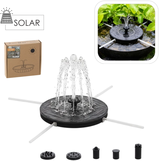 In de verpakking vind je meerdere sproeikoppen voor diverse watereffecten. De fontein is een uitstekende keuze voor zonnige plekken zonder stopcontact – op terrassen, bij vijvers of in vogelbaden.