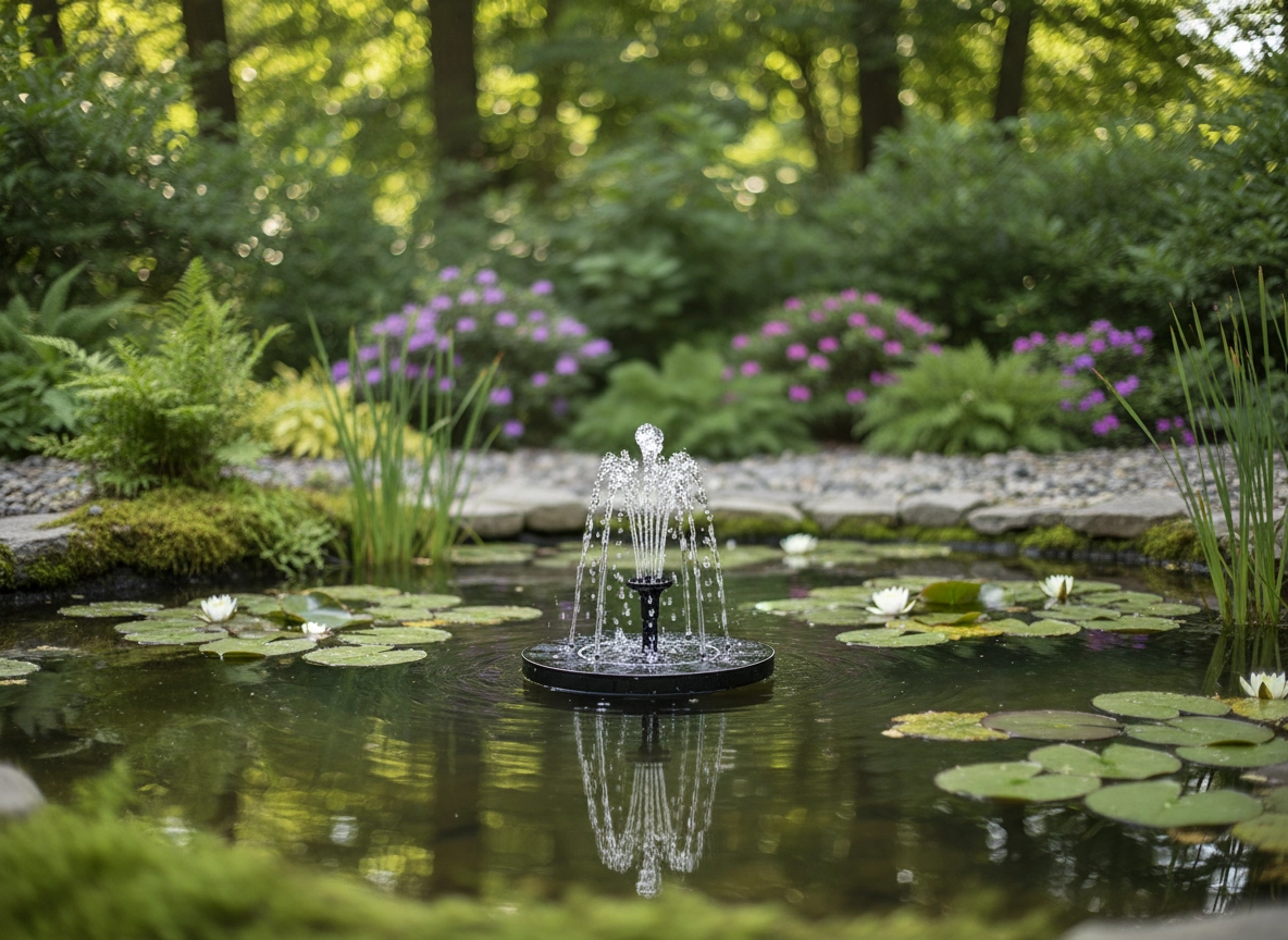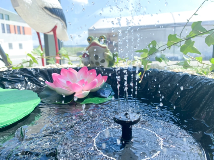 De lichte, ronde schijf drijft op het wateroppervlak en start automatisch in de zon. Perfect voor vogelbaden, kleinere vijvers en tuinschalen.