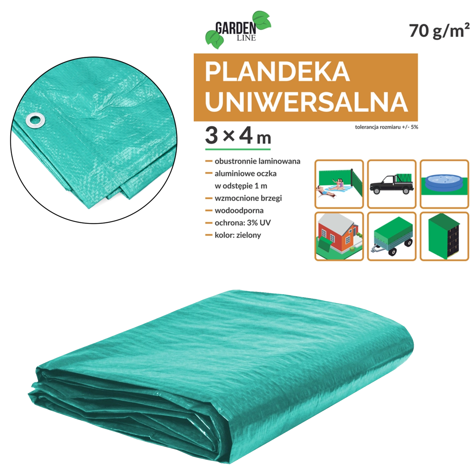 De rondom geplaatste aluminium zeilogen maken snelle en stevige bevestiging met touwen of elastieken mogelijk. De versterkte randen met polypropyleen koord verhogen de weerstand tegen inscheuren en wind, zodat het zeil ook onder zwaardere omstandigheden betrouwbaar blijft zitten.