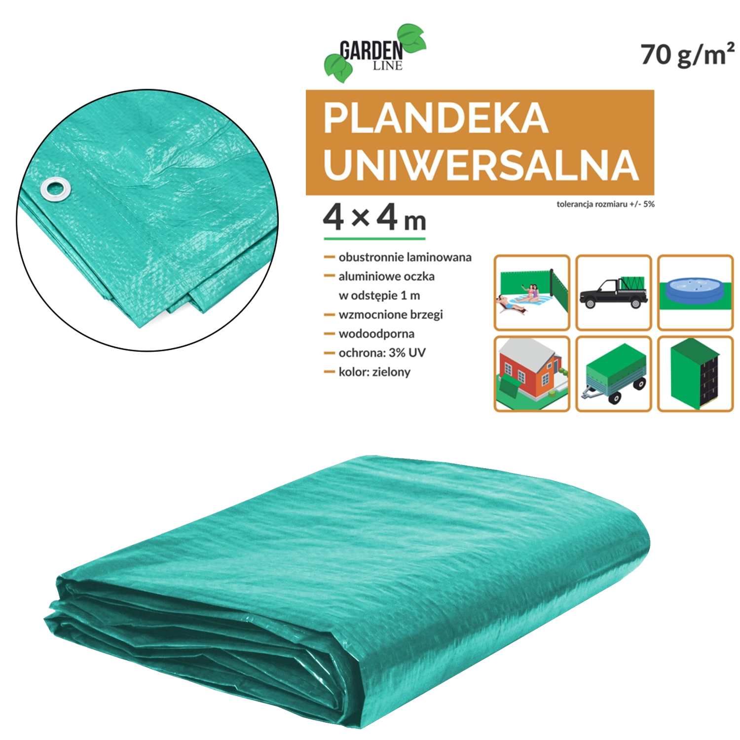 Universeel afdekzeil van hoogwaardige PE met een gramgewicht van 70 g/m², beschermt tegen regen, stof en zon. Dubbelzijdig gelamineerd, met versterkte randen met koord en aluminium ringen elke 1 m. Groene uitvoering, UV-bescherming 3%, afmeting 4 × 4 m (+/−5%).
